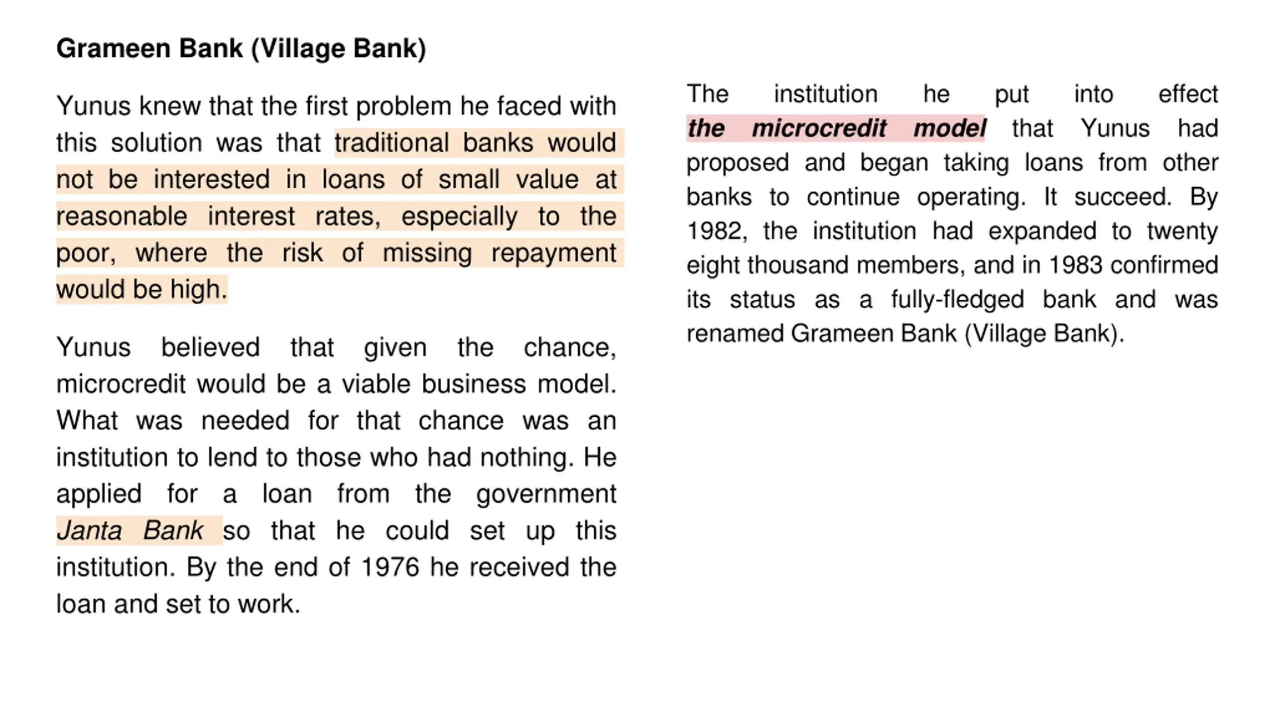 Grameen Bank (Village Bank) The the proposed and began taking loans from other banks to continue operating. It succeed. By 1982, the institution had expanded to twenty eight thousand members, and in 1983 confirmed its status as a fully-fledged bank and was renamed Grameen Bank (Village Bank). institution microcredit he model put that into Yunus effect had Yunus knew that the first problem he faced with this solution was that traditional banks would not be interested in loans of small value at reasonable interest rates, especially to the poor, where the risk of missing repayment would be high. Yunus microcredit would be a viable business model. What was needed for that chance was an institution to lend to those who had nothing. He applied for a loan Janta Bank so that he could set up this institution. By the end of 1976 he received the loan and set to work. believed that given the chance, from the government