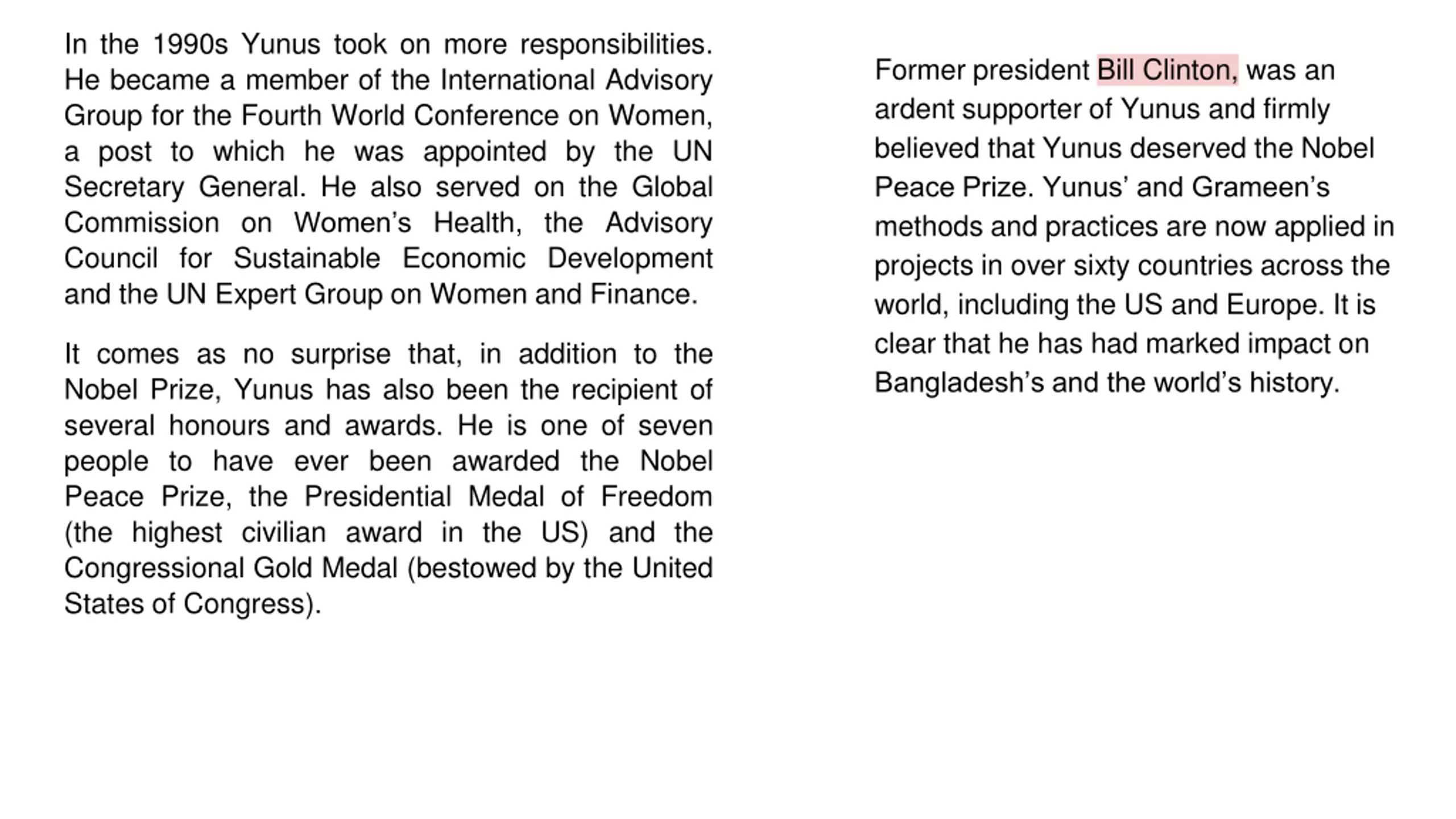 In the 1990s Yunus took on more responsibilities. He became a member of the International Advisory Group for the Fourth World Conference on Women, a post to which he was appointed by the UN Secretary General. He also served on the Global Commission on Women s Health, the Advisory Council for Sustainable Economic Development and the UN Expert Group on Women and Finance. Former president Bill Clinton, was an ardent supporter of Yunus and firmly believed that Yunus deserved the Nobel Peace Prize. Yunus and Grameen s methods and practices are now applied in projects in over sixty countries across the world, including the US and Europe. It is clear that he has had marked impact on Bangladesh s and the world s history. It comes as no surprise that, in addition to the Nobel Prize, Yunus has also been the recipient of several honours and awards. He is one of seven people to have ever been awarded the Nobel Peace Prize, the Presidential Medal of Freedom (the highest civilian award in the US) and the Congressional Gold Medal (bestowed by the United States of Congress).