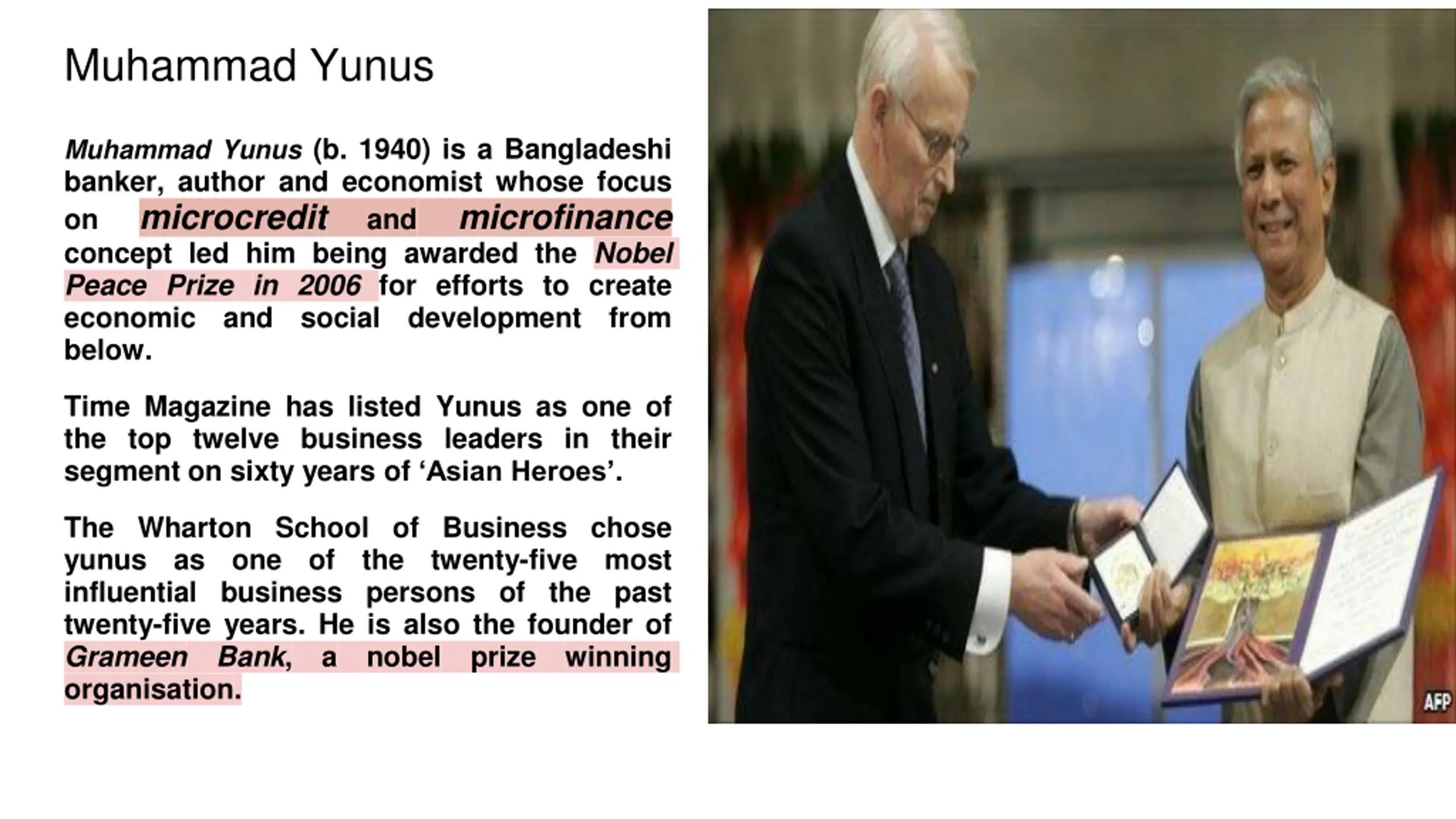 Muhammad Yunus Muhammad Yunus (b. 1940) is a Bangladeshi banker, author and economist whose focus on microcredit and concept led him being awarded the Nobel Peace Prize in 2006 for efforts to create economic and social below. microfinance development from Time Magazine has listed Yunus as one of the top twelve business leaders in their segment on sixty years of Asian Heroes . The Wharton School of Business chose yunus as one of the influential business persons of the past twenty-five years. He is also the founder of Grameen Bank, a nobel organisation. twenty-five most prize winning