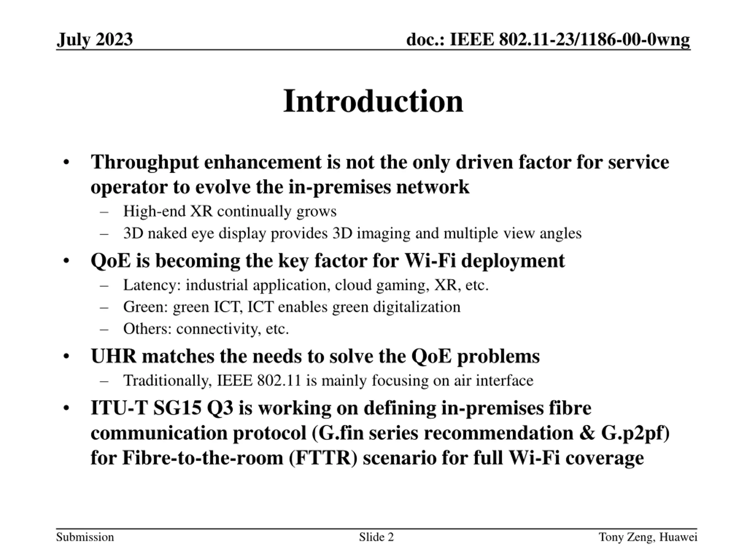July 2023 doc.: IEEE 802.11-23/1186-00-0wng Introduction Throughput enhancement is not the only driven factor for service operator to evolve the in-premises network High-end XR continually grows 3D naked eye display provides 3D imaging and multiple view angles QoE is becoming the key factor for Wi-Fi deployment Latency: industrial application, cloud gaming, XR, etc. Green: green ICT, ICT enables green digitalization Others: connectivity, etc. UHR matches the needs to solve the QoE problems Traditionally, IEEE 802.11 is mainly focusing on air interface ITU-T SG15 Q3 is working on defining in-premises fibre communication protocol (G.fin series recommendation & G.p2pf) for Fibre-to-the-room (FTTR) scenario for full Wi-Fi coverage Submission Slide 2 Tony Zeng, Huawei
