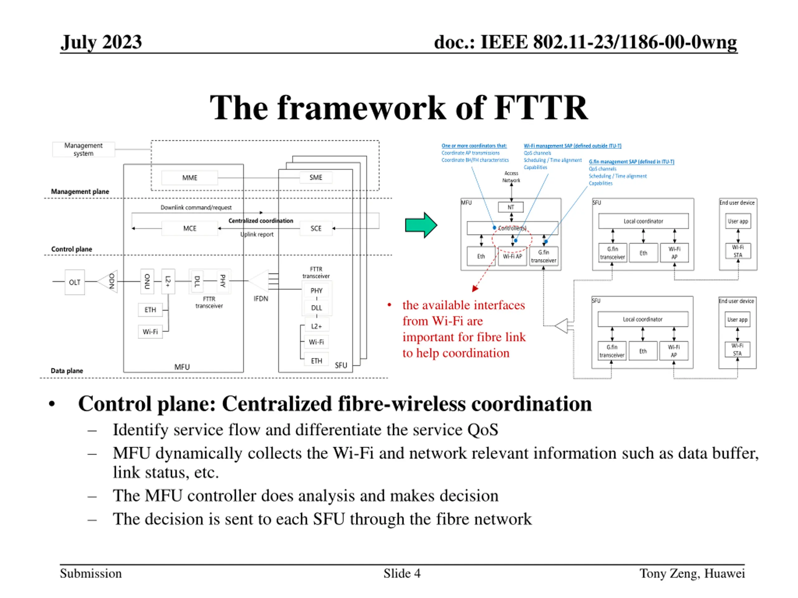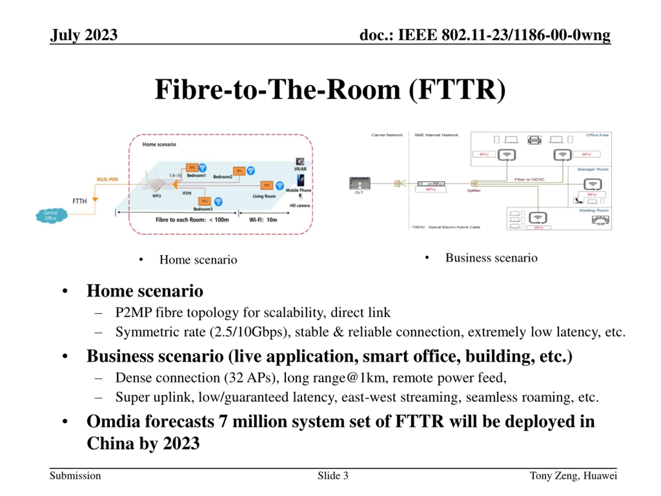 July 2023 doc.: IEEE 802.11-23/1186-00-0wng Fibre-to-The-Room (FTTR) Business scenario Home scenario Home scenario P2MP fibre topology for scalability, direct link Symmetric rate (2.5/10Gbps), stable & reliable connection, extremely low latency, etc. Business scenario (live application, smart office, building, etc.) Dense connection (32 APs), long range@1km, remote power feed, Super uplink, low/guaranteed latency, east-west streaming, seamless roaming, etc. Omdia forecasts 7 million system set of FTTR will be deployed in China by 2023 Submission Slide 3 Tony Zeng, Huawei