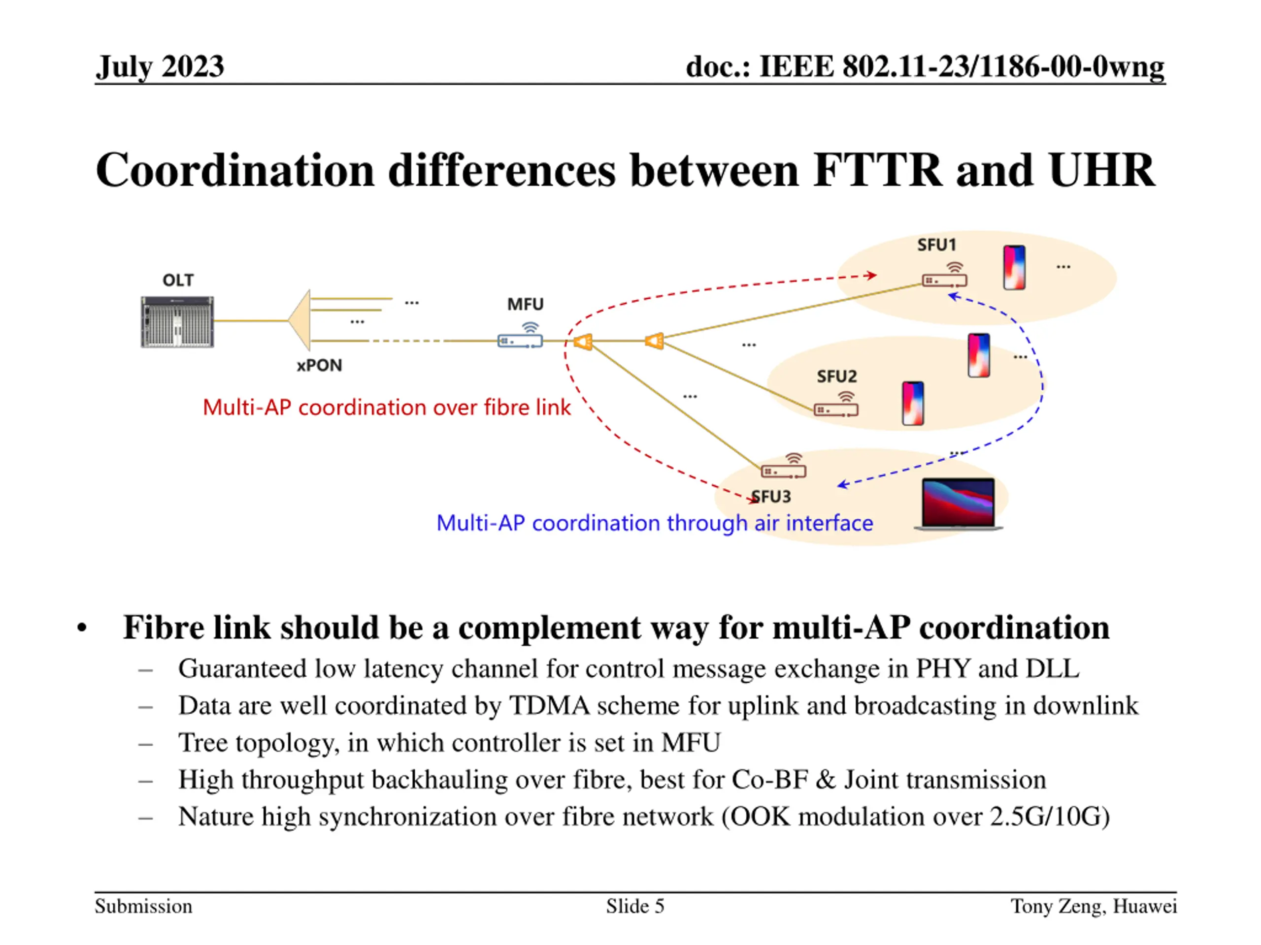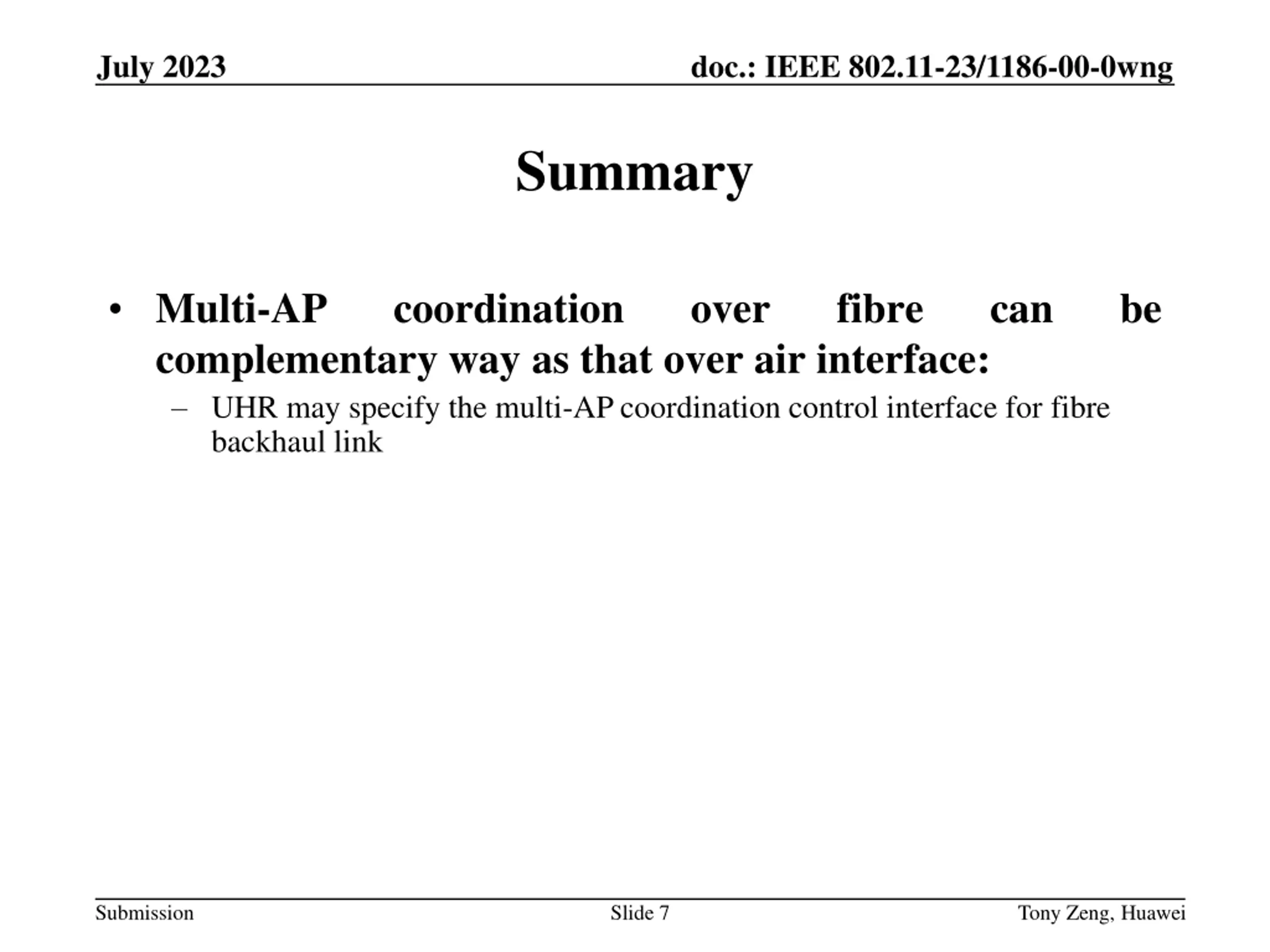 July 2023 doc.: IEEE 802.11-23/1186-00-0wng Summary Multi-AP complementary way as that over air interface: UHR may specify the multi-AP coordination control interface for fibre backhaul link coordination over fibre can be Submission Slide 7 Tony Zeng, Huawei