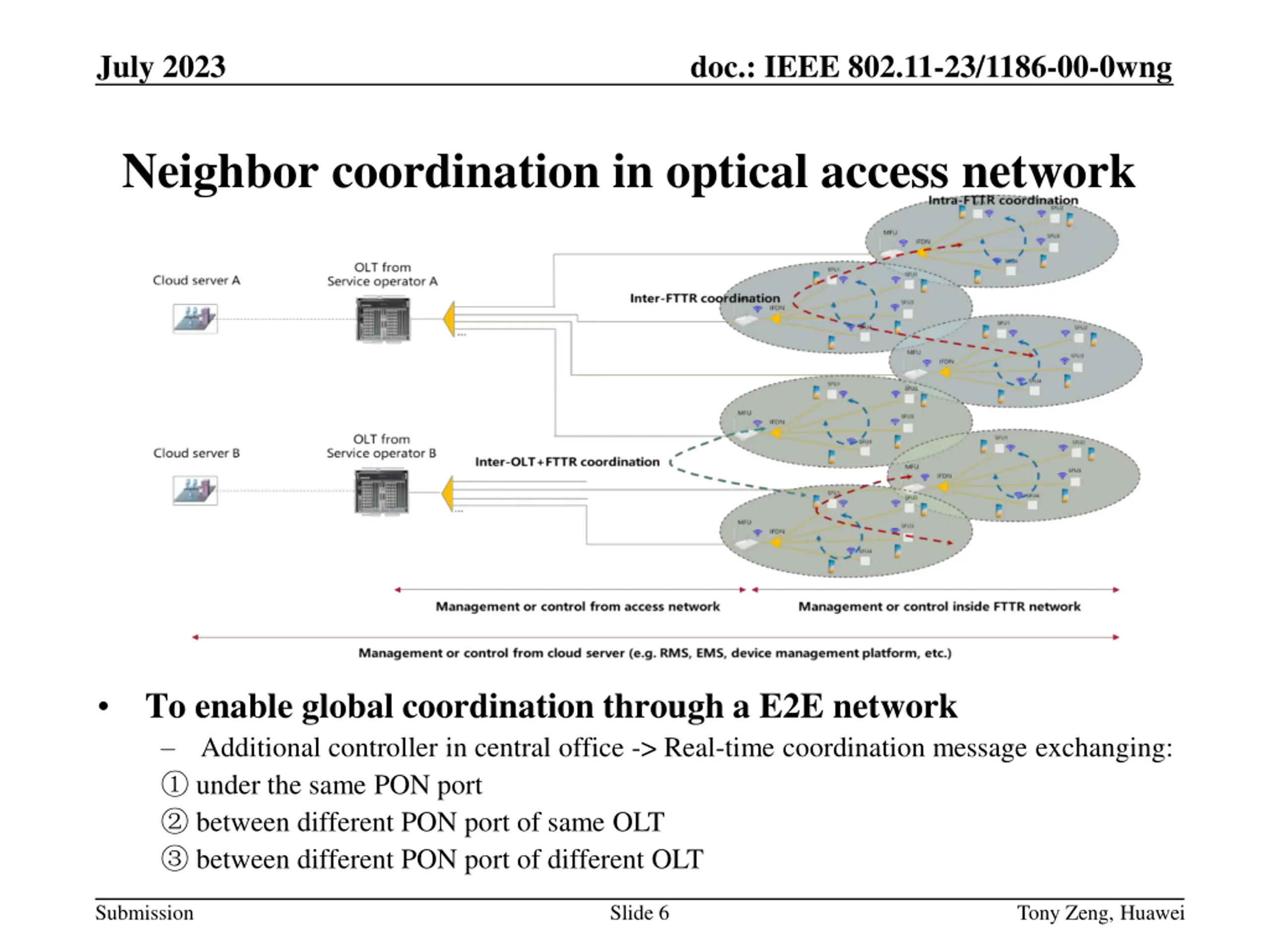 July 2023 doc.: IEEE 802.11-23/1186-00-0wng Neighbor coordination in optical access network To enable global coordination through a E2E network Additional controller in central office -> Real-time coordination message exchanging: under the same PON port between different PON port of same OLT between different PON port of different OLT Submission Slide 6 Tony Zeng, Huawei