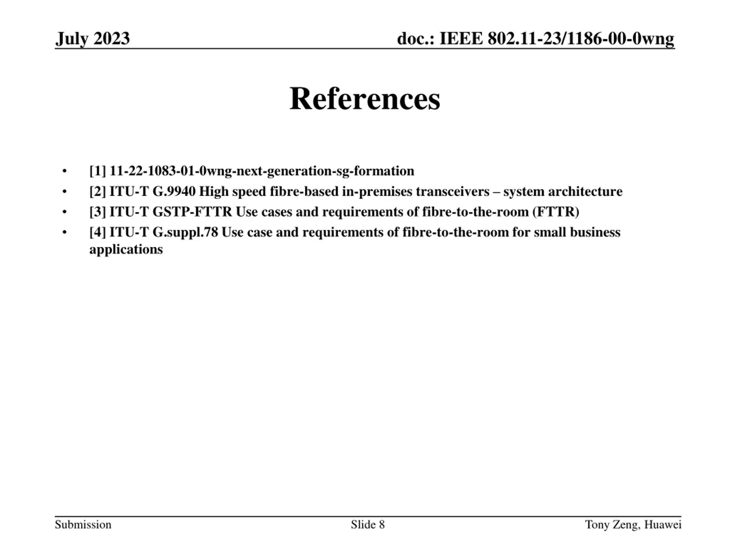 July 2023 doc.: IEEE 802.11-23/1186-00-0wng References [1] 11-22-1083-01-0wng-next-generation-sg-formation [2] ITU-T G.9940 High speed fibre-based in-premises transceivers system architecture [3] ITU-T GSTP-FTTR Use cases and requirements of fibre-to-the-room (FTTR) [4] ITU-T G.suppl.78 Use case and requirements of fibre-to-the-room for small business applications Submission Slide 8 Tony Zeng, Huawei