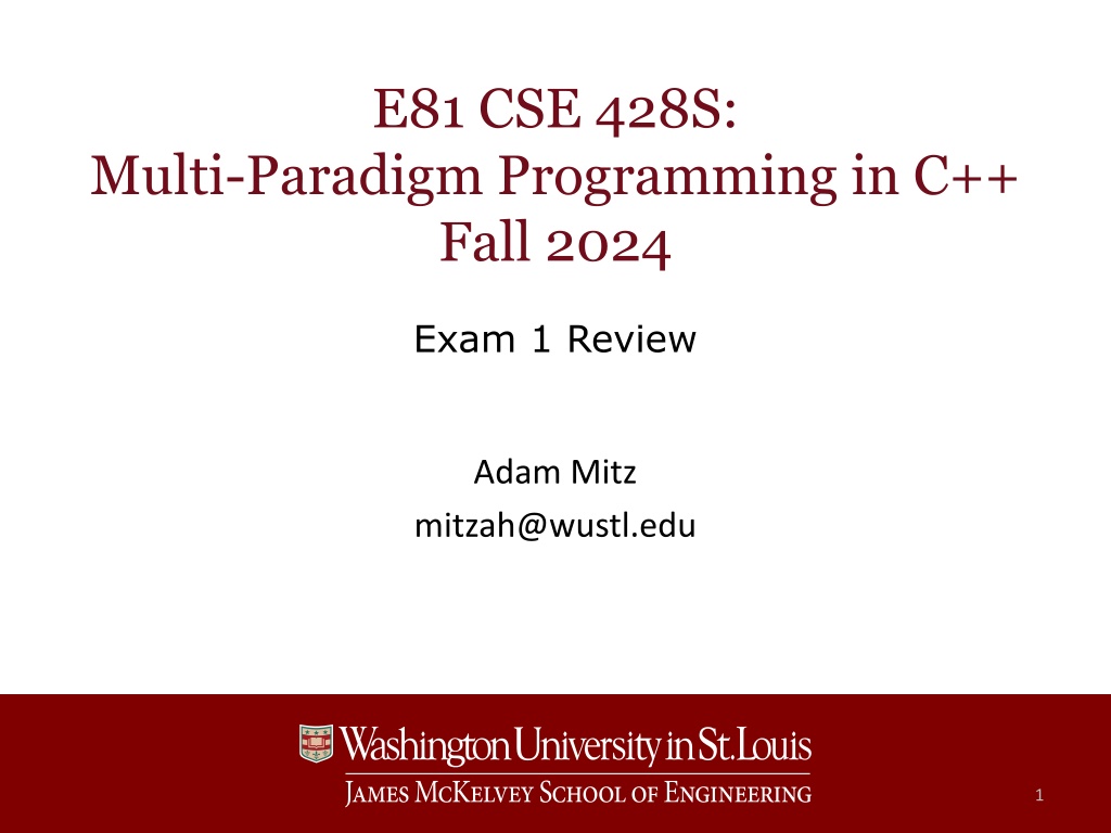 E81 CSE 428S: Multi-Paradigm Programming in C++ Fall 2024 Exam 1 Review Adam Mitz mitzah@wustl.edu 1
