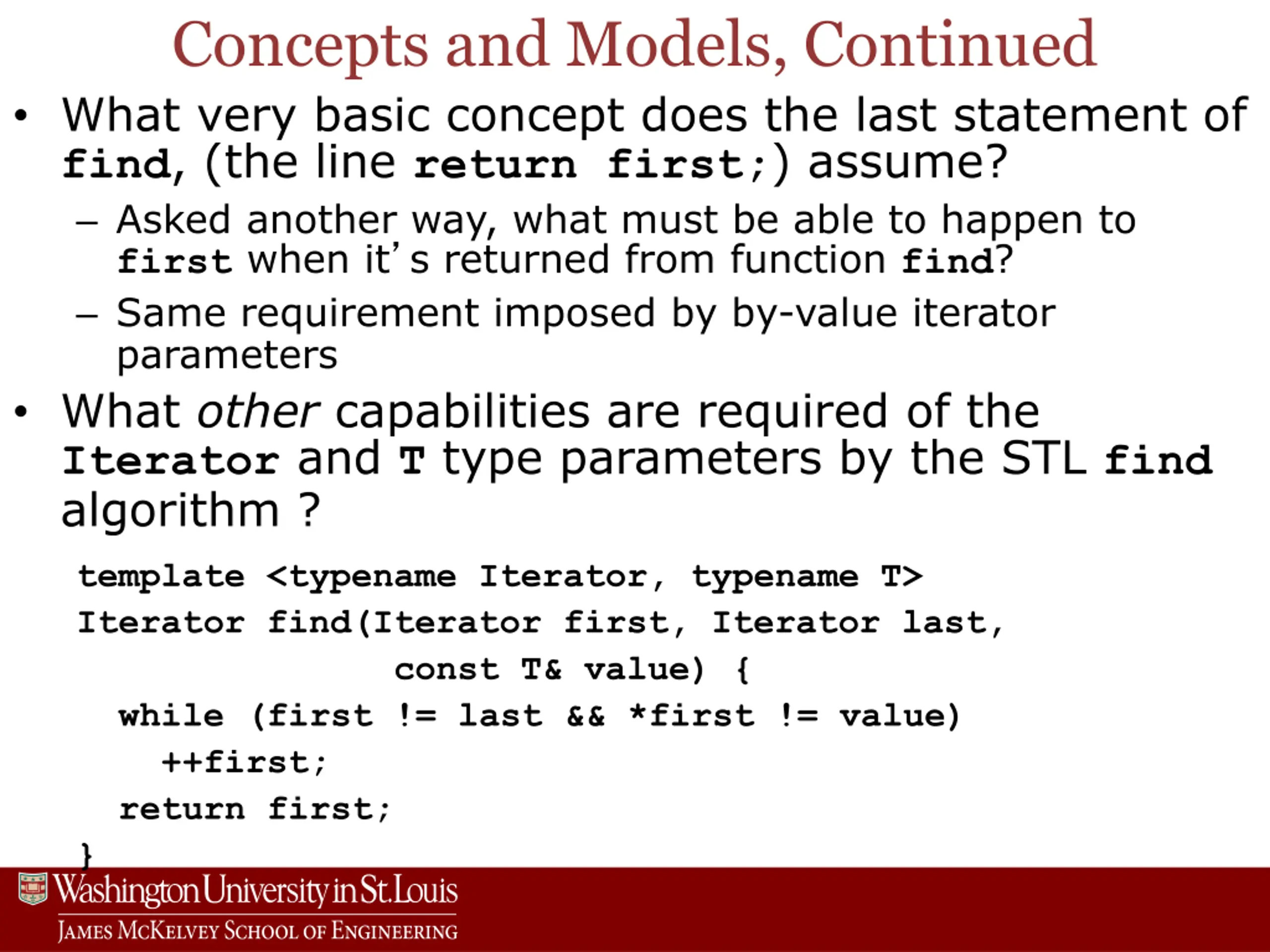 Concepts and Models, Continued What very basic concept does the last statement of find, (the line return first;) assume? Asked another way, what must be able to happen to first when it s returned from function find? Same requirement imposed by by-value iterator parameters What other capabilities are required of the Iterator and T type parameters by the STL find algorithm ? template <typename Iterator, typename T> Iterator find(Iterator first, Iterator last, const T& value) { while (first != last && *first != value) ++first; return first; }
