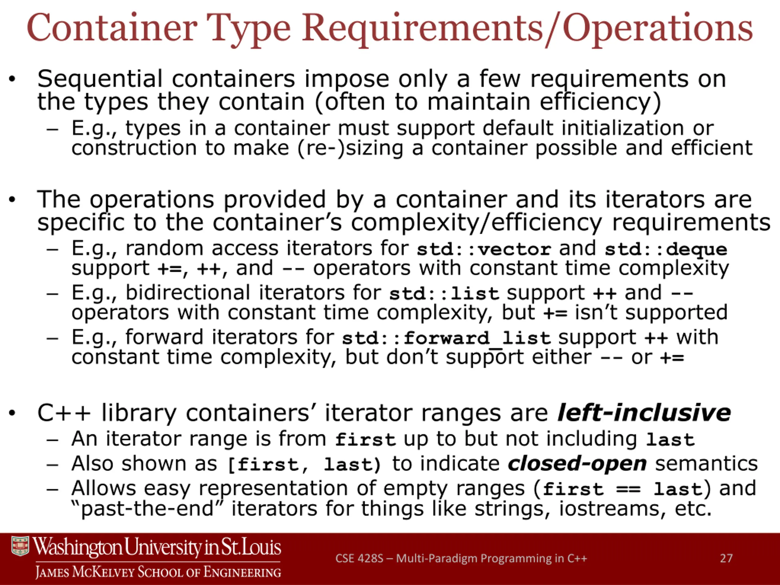 Container Type Requirements/Operations Sequential containers impose only a few requirements on the types they contain (often to maintain efficiency) E.g., types in a container must support default initialization or construction to make (re-)sizing a container possible and efficient The operations provided by a container and its iterators are specific to the container s complexity/efficiency requirements E.g., random access iterators for std::vector and std::deque support +=, ++, and -- operators with constant time complexity E.g., bidirectional iterators for std::list support ++ and -- operators with constant time complexity, but +=isn t supported E.g., forward iterators for std::forward_list support ++ with constant time complexity, but don t support either -- or += C++ library containers iterator ranges are left-inclusive An iterator range is from first up to but not including last Also shown as [first, last) to indicate closed-open semantics Allows easy representation of empty ranges (first == last) and past-the-end iterators for things like strings, iostreams, etc. CSE 428S Multi-Paradigm Programming in C++ 27