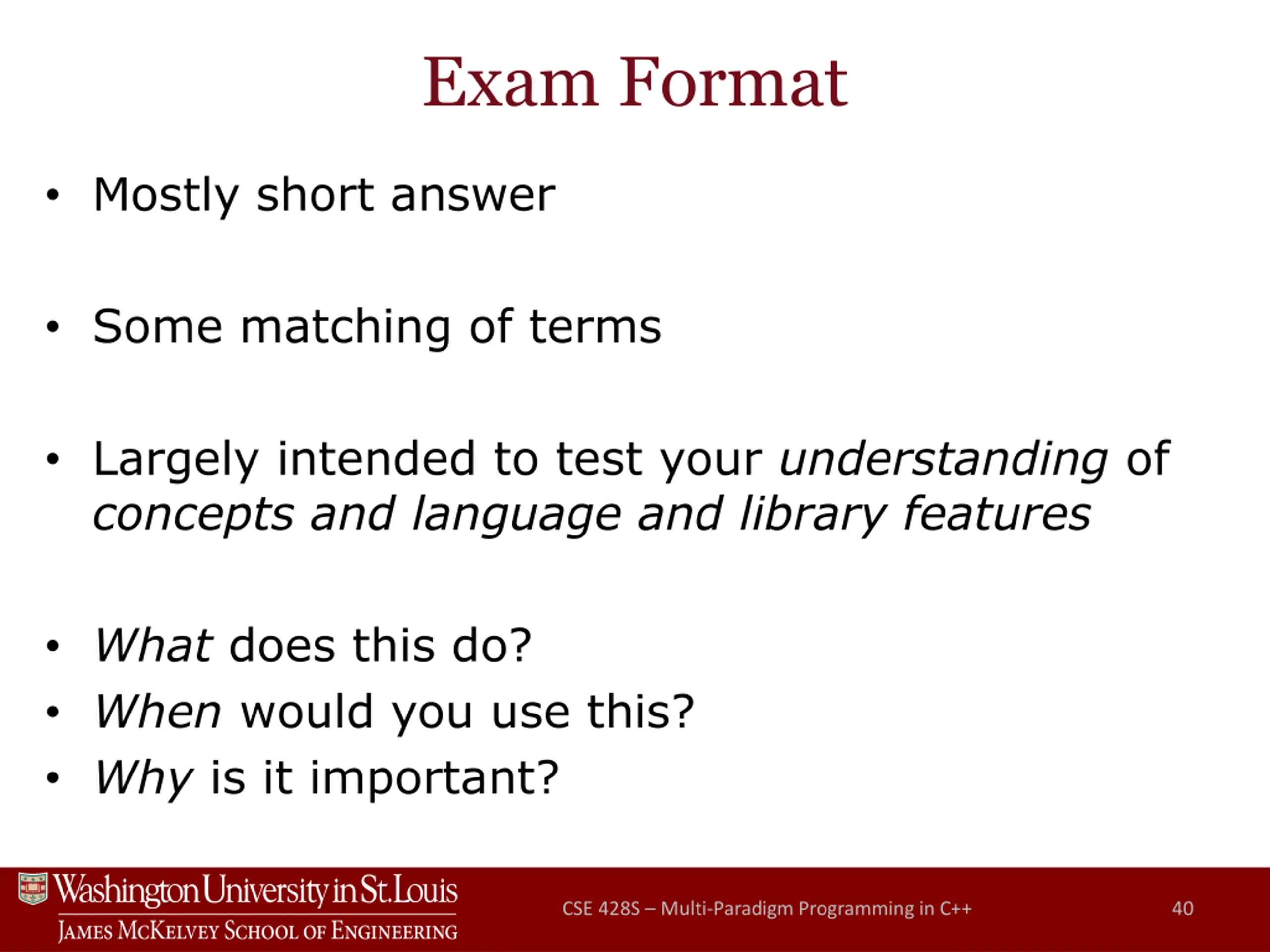 Exam Format Mostly short answer Some matching of terms Largely intended to test your understanding of concepts and language and library features What does this do? When would you use this? Why is it important? CSE 428S Multi-Paradigm Programming in C++ 40