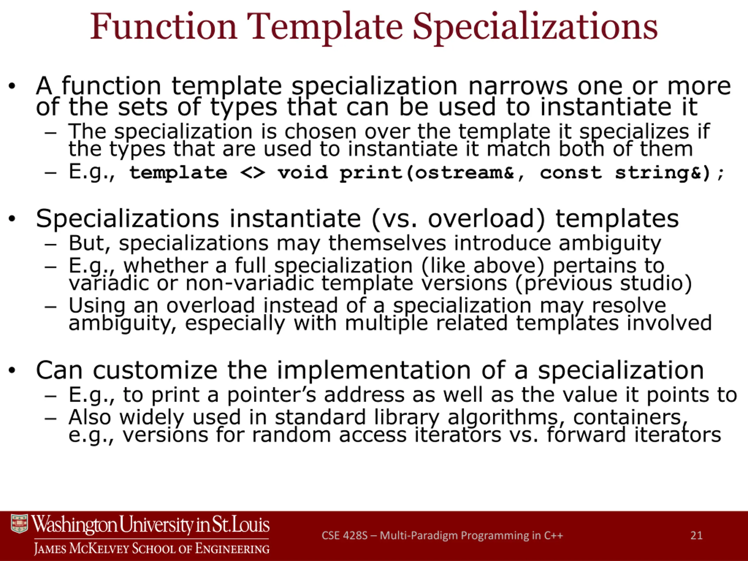 Function Template Specializations A function template specialization narrows one or more of the sets of types that can be used to instantiate it The specialization is chosen over the template it specializes if the types that are used to instantiate it match both of them E.g.,template <> void print(ostream&, const string&); Specializations instantiate (vs. overload) templates But, specializations may themselves introduce ambiguity E.g., whether a full specialization (like above) pertains to variadic or non-variadic template versions (previous studio) Using an overload instead of a specialization may resolve ambiguity, especially with multiple related templates involved Can customize the implementation of a specialization E.g., to print a pointer s address as well as the value it points to Also widely used in standard library algorithms, containers, e.g., versions for random access iterators vs. forward iterators CSE 428S Multi-Paradigm Programming in C++ 21