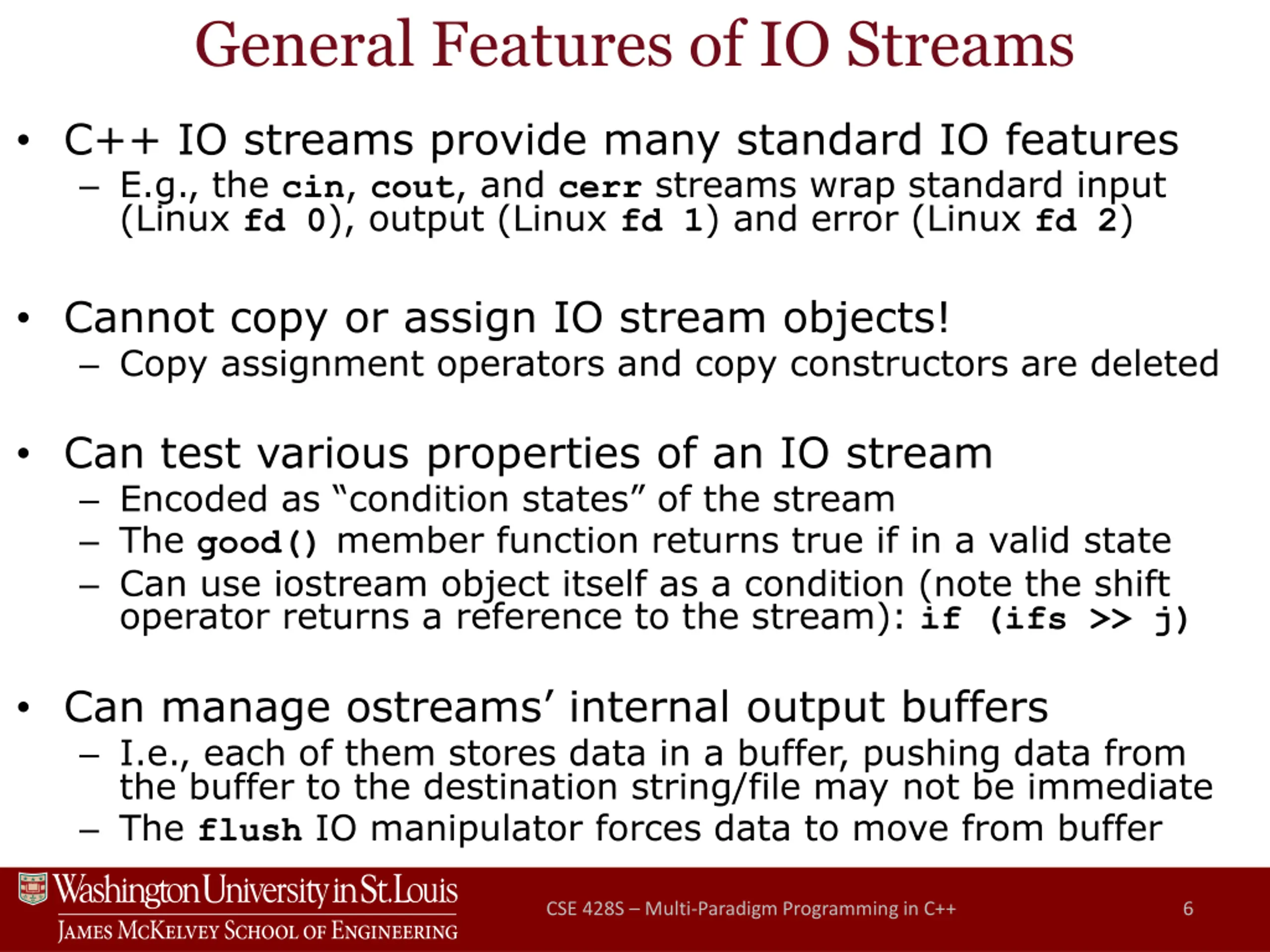 General Features of IO Streams C++ IO streams provide many standard IO features E.g., the cin, cout, and cerr streams wrap standard input (Linux fd 0), output (Linux fd 1) and error (Linux fd 2) Cannot copy or assign IO stream objects! Copy assignment operators and copy constructors are deleted Can test various properties of an IO stream Encoded as condition states of the stream The good() member function returns true if in a valid state Can use iostream object itself as a condition (note the shift operator returns a reference to the stream): if (ifs >> j) Can manage ostreams internal output buffers I.e., each of them stores data in a buffer, pushing data from the buffer to the destination string/file may not be immediate The flush IO manipulator forces data to move from buffer CSE 428S Multi-Paradigm Programming in C++ 6