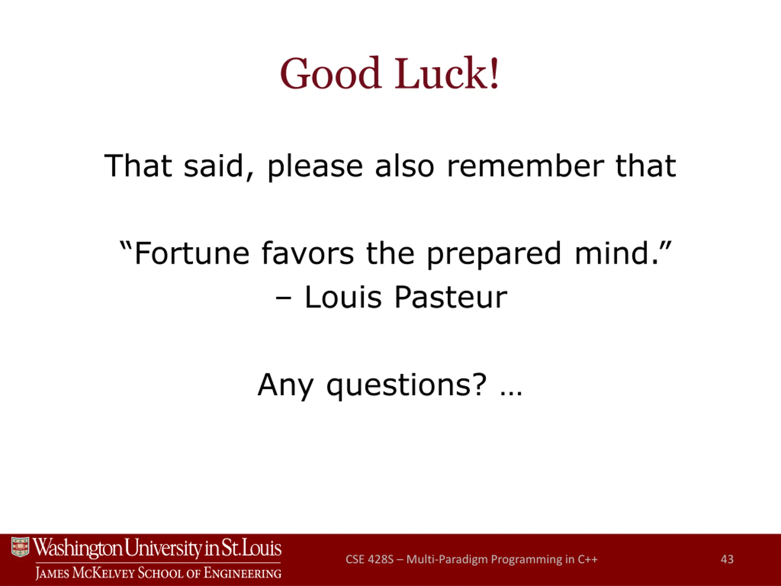 Good Luck! That said, please also remember that Fortune favors the prepared mind. Louis Pasteur Any questions? CSE 428S Multi-Paradigm Programming in C++ 43