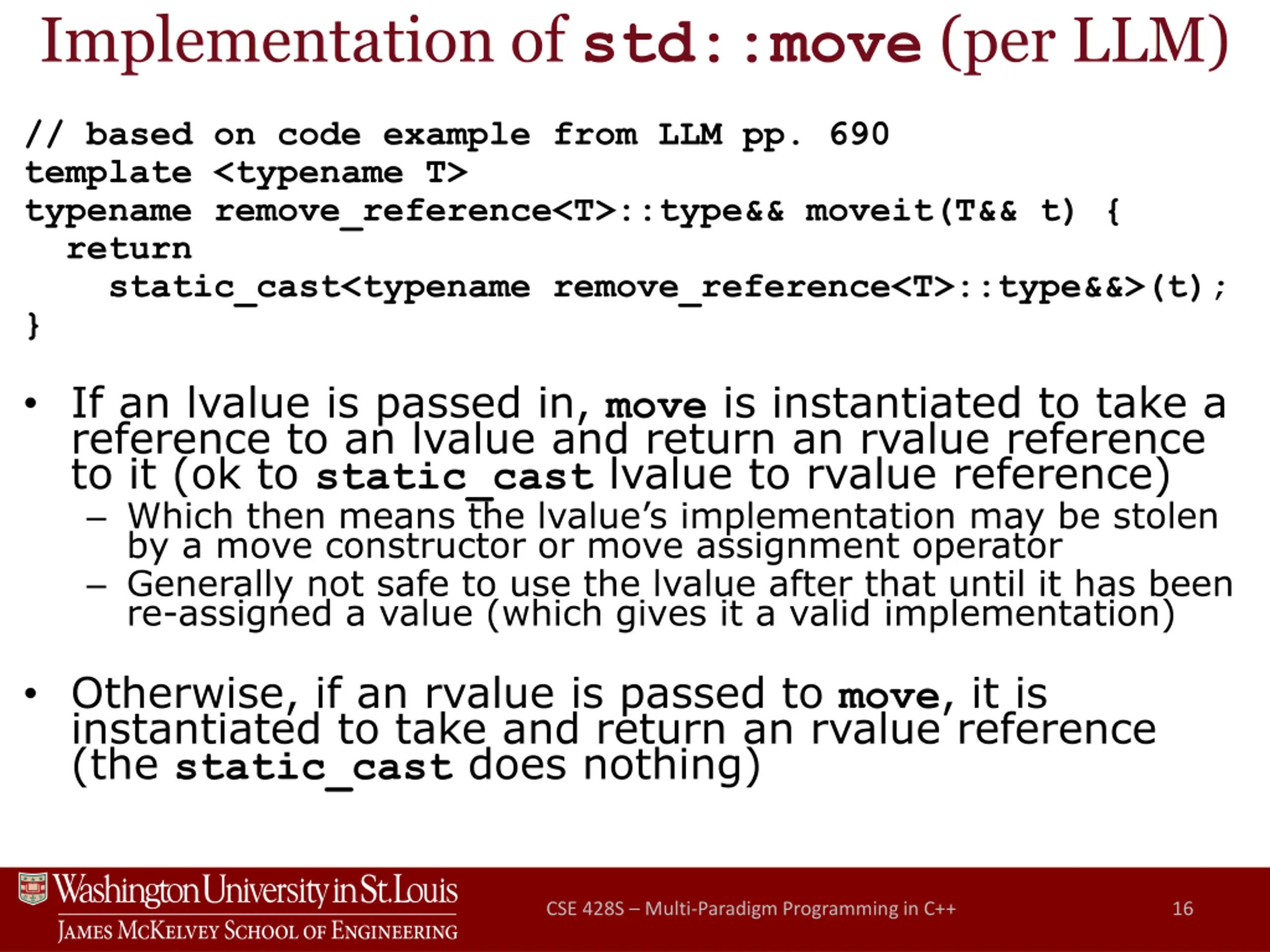 Implementation of std::move (per LLM) // based on code example from LLM pp. 690 template <typename T> typename remove_reference<T>::type&& moveit(T&& t) { return static_cast<typename remove_reference<T>::type&&>(t); } If an lvalue is passed in, move is instantiated to take a reference to an lvalue and return an rvalue reference to it (ok to static_cast lvalue to rvalue reference) Which then means the lvalue s implementation may be stolen by a move constructor or move assignment operator Generally not safe to use the lvalue after that until it has been re-assigned a value (which gives it a valid implementation) Otherwise, if an rvalue is passed to move, it is instantiated to take and return an rvalue reference (the static_cast does nothing) CSE 428S Multi-Paradigm Programming in C++ 16