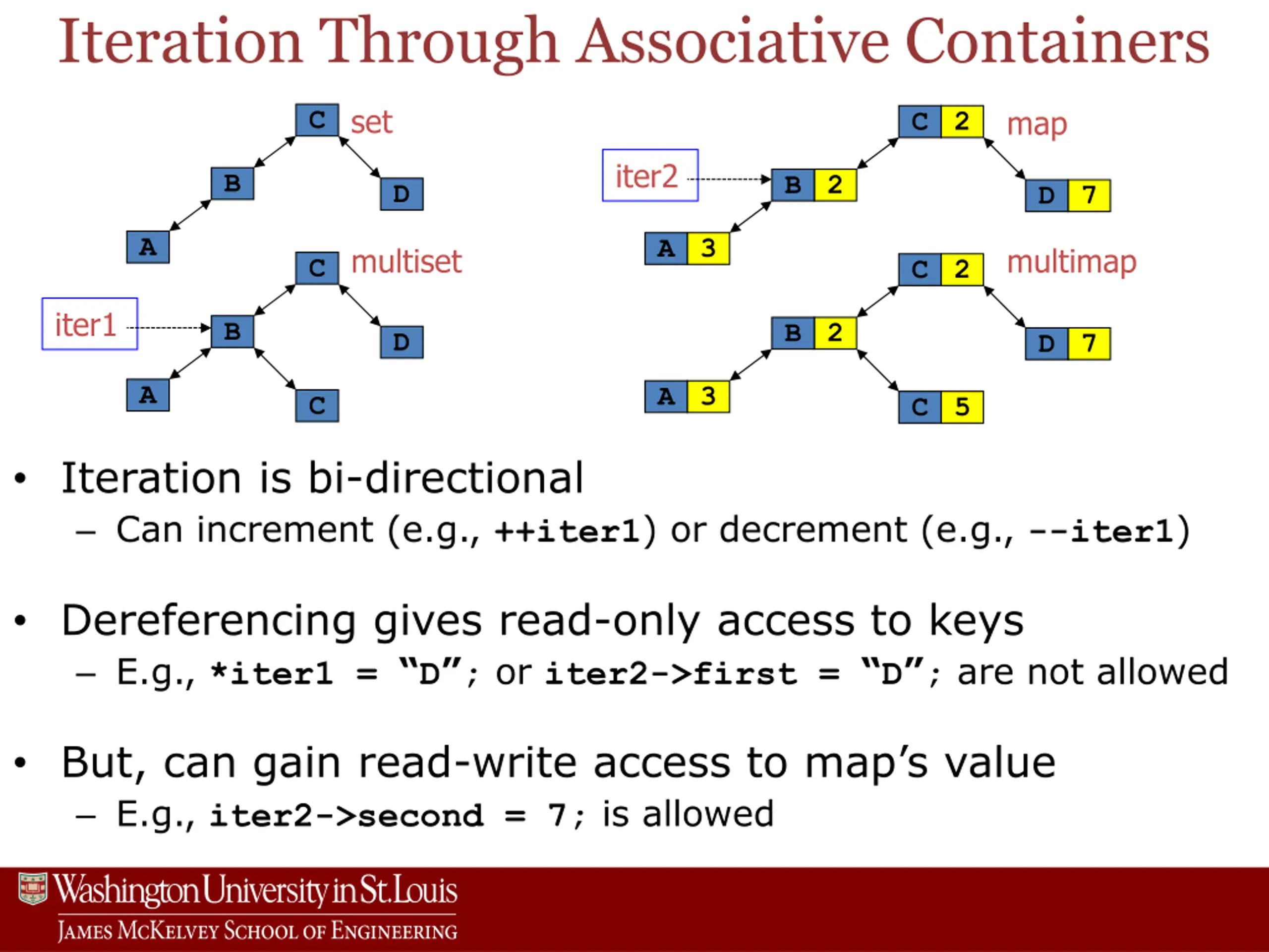 Iteration Through Associative Containers set map C C 2 iter2 B B 2 D D 7 A A 3 multiset multimap C C 2 iter1 B B 2 D D 7 A A 3 C C 5 Iteration is bi-directional Can increment (e.g., ++iter1) or decrement (e.g., --iter1) Dereferencing gives read-only access to keys E.g., *iter1 = D ; or iter2->first = D ; are not allowed But, can gain read-write access to map s value E.g., iter2->second = 7; is allowed