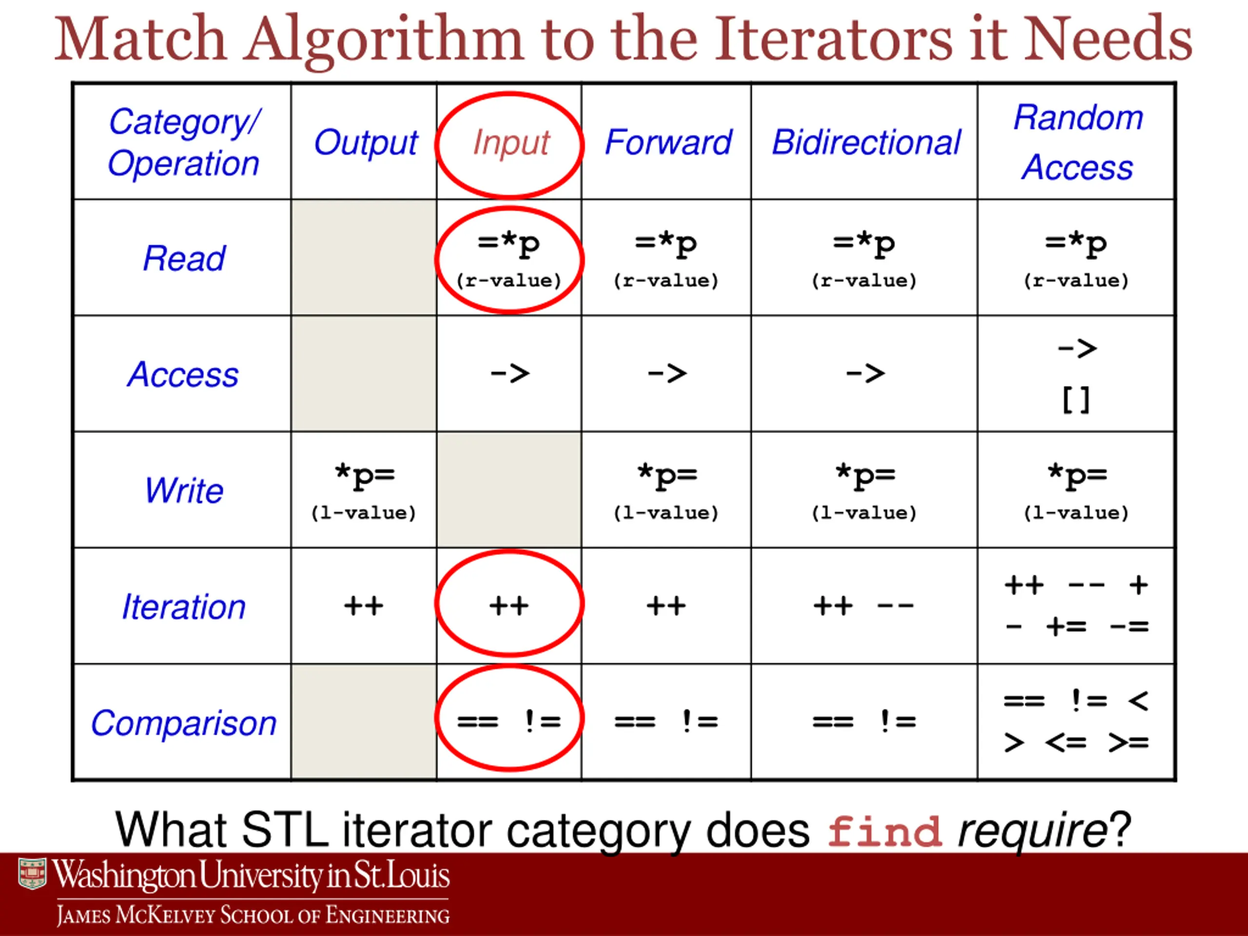 Match Algorithm to the Iterators it Needs Random Access Category/ Operation Output Input Forward Bidirectional =*p (r-value) =*p (r-value) =*p (r-value) =*p (r-value) Read -> [] Access -> -> -> *p= (l-value) *p= (l-value) *p= (l-value) *p= (l-value) Write ++ -- + - += -= Iteration ++ ++ ++ ++ -- == != < > <= >= Comparison == != == != == != What STL iterator category does findrequire?