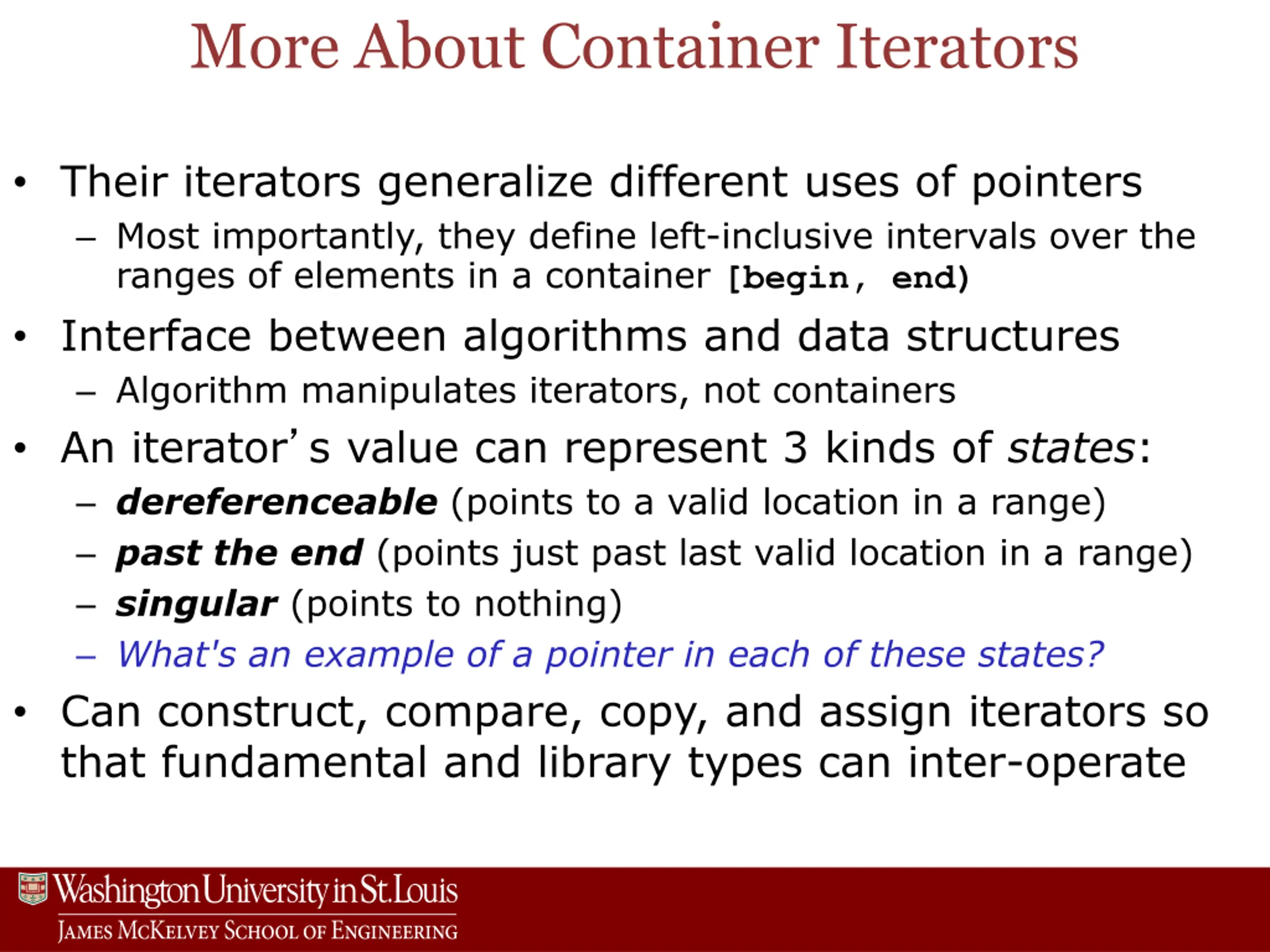 More About Container Iterators Their iterators generalize different uses of pointers Most importantly, they define left-inclusive intervals over the ranges of elements in a container [begin, end) Interface between algorithms and data structures Algorithm manipulates iterators, not containers An iterator s value can represent 3 kinds of states: dereferenceable(points to a valid location in a range) past the end(points just past last valid location in a range) singular(points to nothing) What's an example of a pointer in each of these states? Can construct, compare, copy, and assign iterators so that fundamental and library types can inter-operate