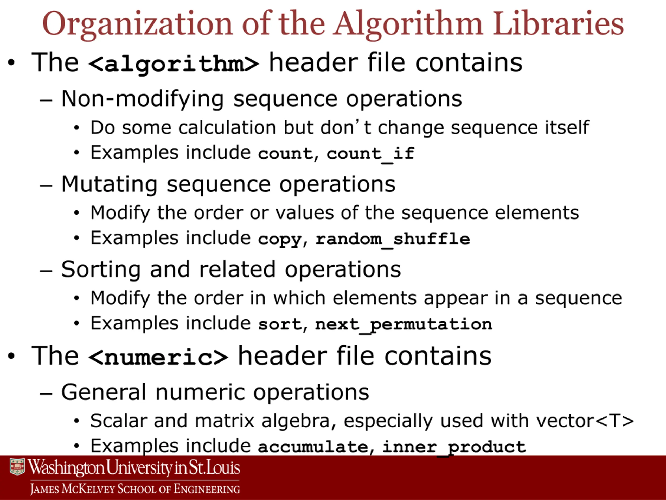 Organization of the Algorithm Libraries The <algorithm> header file contains Non-modifying sequence operations Do some calculation but don t change sequence itself Examples include count, count_if Mutating sequence operations Modify the order or values of the sequence elements Examples include copy, random_shuffle Sorting and related operations Modify the order in which elements appear in a sequence Examples include sort, next_permutation The <numeric> header file contains General numeric operations Scalar and matrix algebra, especially used with vector<T> Examples include accumulate, inner_product