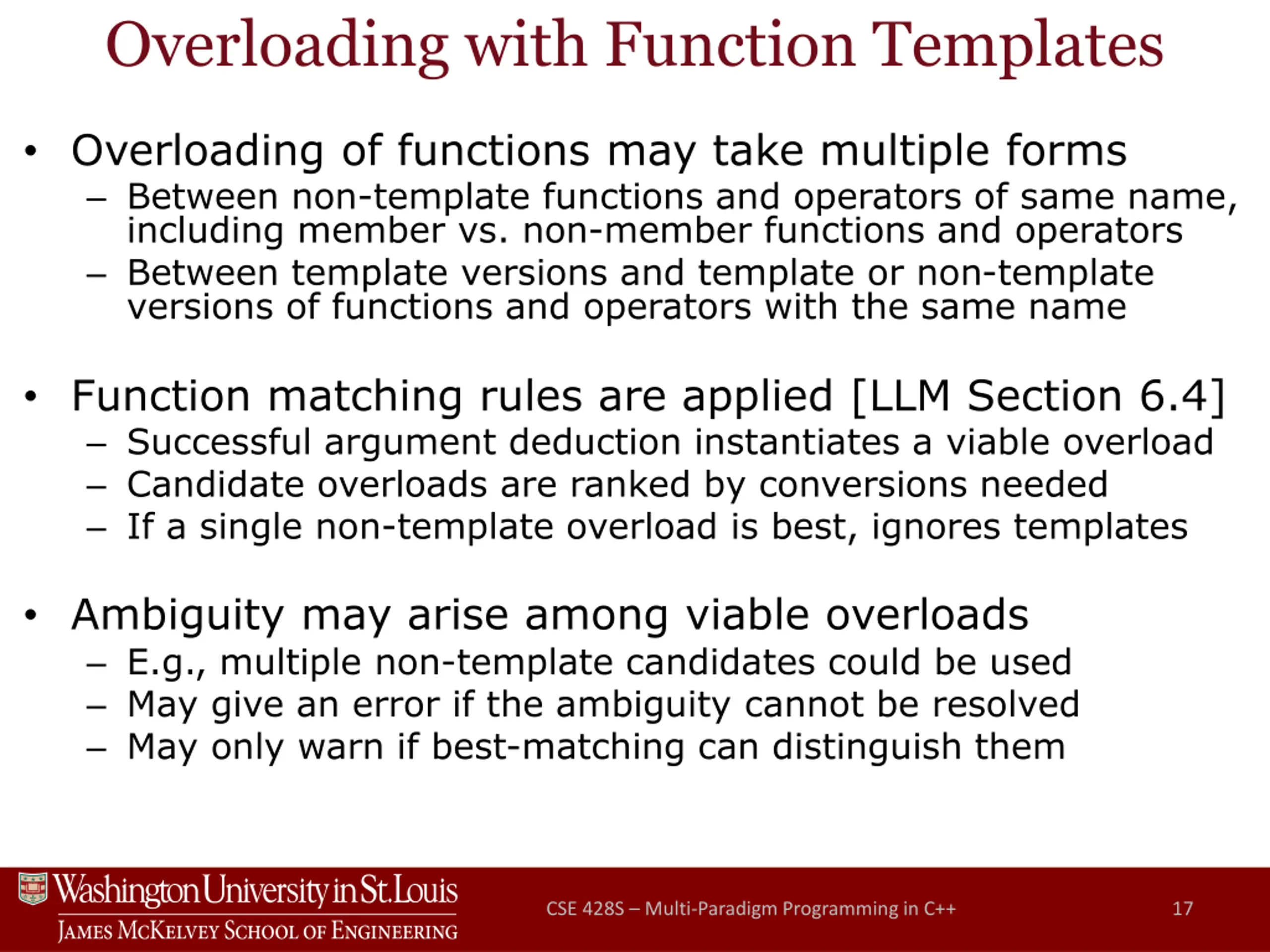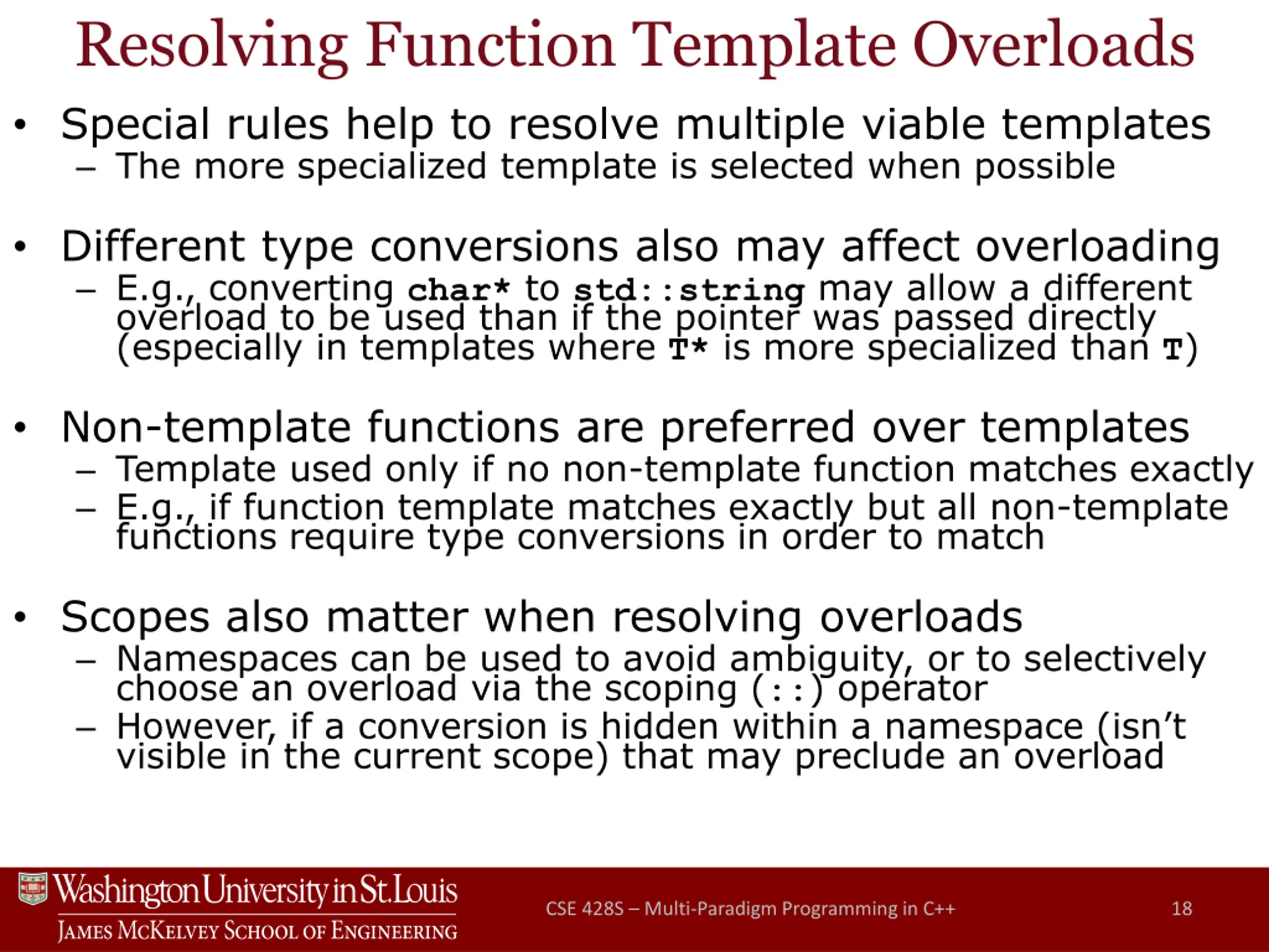 Overloading with Function Templates Overloading of functions may take multiple forms Between non-template functions and operators of same name, including member vs. non-member functions and operators Between template versions and template or non-template versions of functions and operators with the same name Function matching rules are applied [LLM Section 6.4] Successful argument deduction instantiates a viable overload Candidate overloads are ranked by conversions needed If a single non-template overload is best, ignores templates Ambiguity may arise among viable overloads E.g., multiple non-template candidates could be used May give an error if the ambiguity cannot be resolved May only warn if best-matching can distinguish them CSE 428S Multi-Paradigm Programming in C++ 17