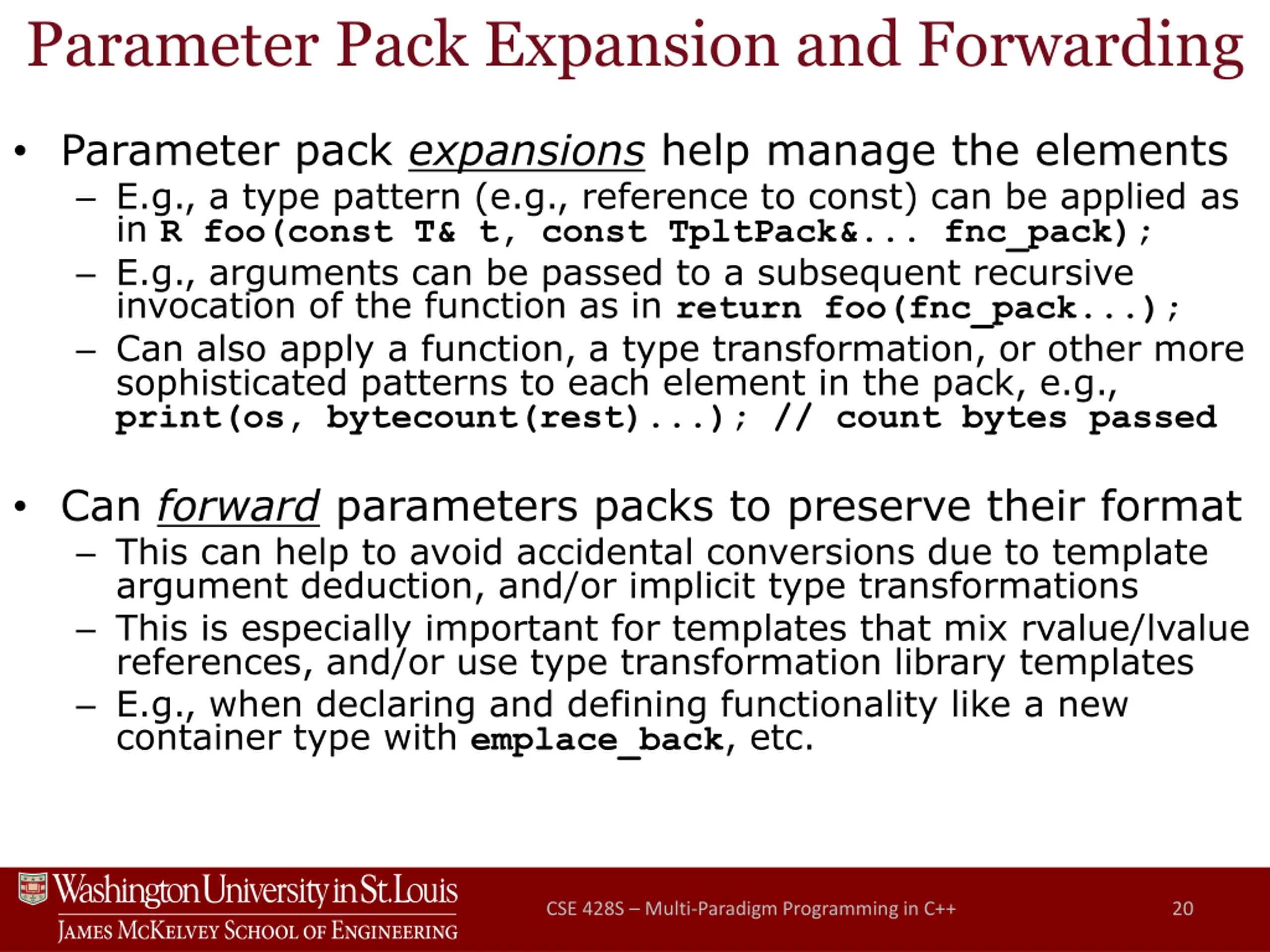 Parameter Pack Expansion and Forwarding Parameter pack expansions help manage the elements E.g., a type pattern (e.g., reference to const) can be applied as in R foo(const T& t, const TpltPack&... fnc_pack); E.g., arguments can be passed to a subsequent recursive invocation of the function as in return foo(fnc_pack...); Can also apply a function, a type transformation, or other more sophisticated patterns to each element in the pack, e.g., print(os, bytecount(rest)...); // count bytes passed Can forward parameters packs to preserve their format This can help to avoid accidental conversions due to template argument deduction, and/or implicit type transformations This is especially important for templates that mix rvalue/lvalue references, and/or use type transformation library templates E.g., when declaring and defining functionality like a new container type with emplace_back, etc. CSE 428S Multi-Paradigm Programming in C++ 20