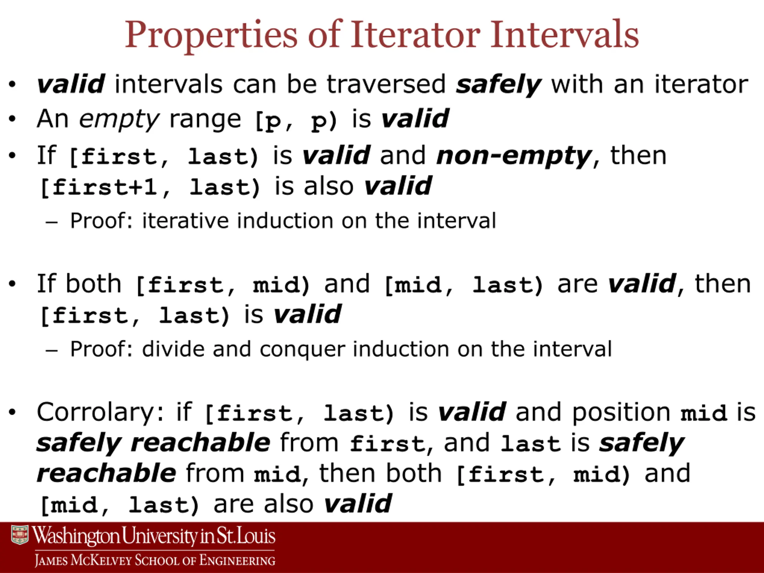 Properties of Iterator Intervals valid intervals can be traversed safely with an iterator An empty range [p, p) is valid If [first, last) is valid and non-empty, then [first+1, last) is also valid Proof: iterative induction on the interval If both [first, mid) and [mid, last) are valid, then [first, last) is valid Proof: divide and conquer induction on the interval Corrolary: if [first, last) is valid and position mid is safelyreachable from first, and last is safely reachable from mid, then both [first, mid) and [mid, last) are also valid