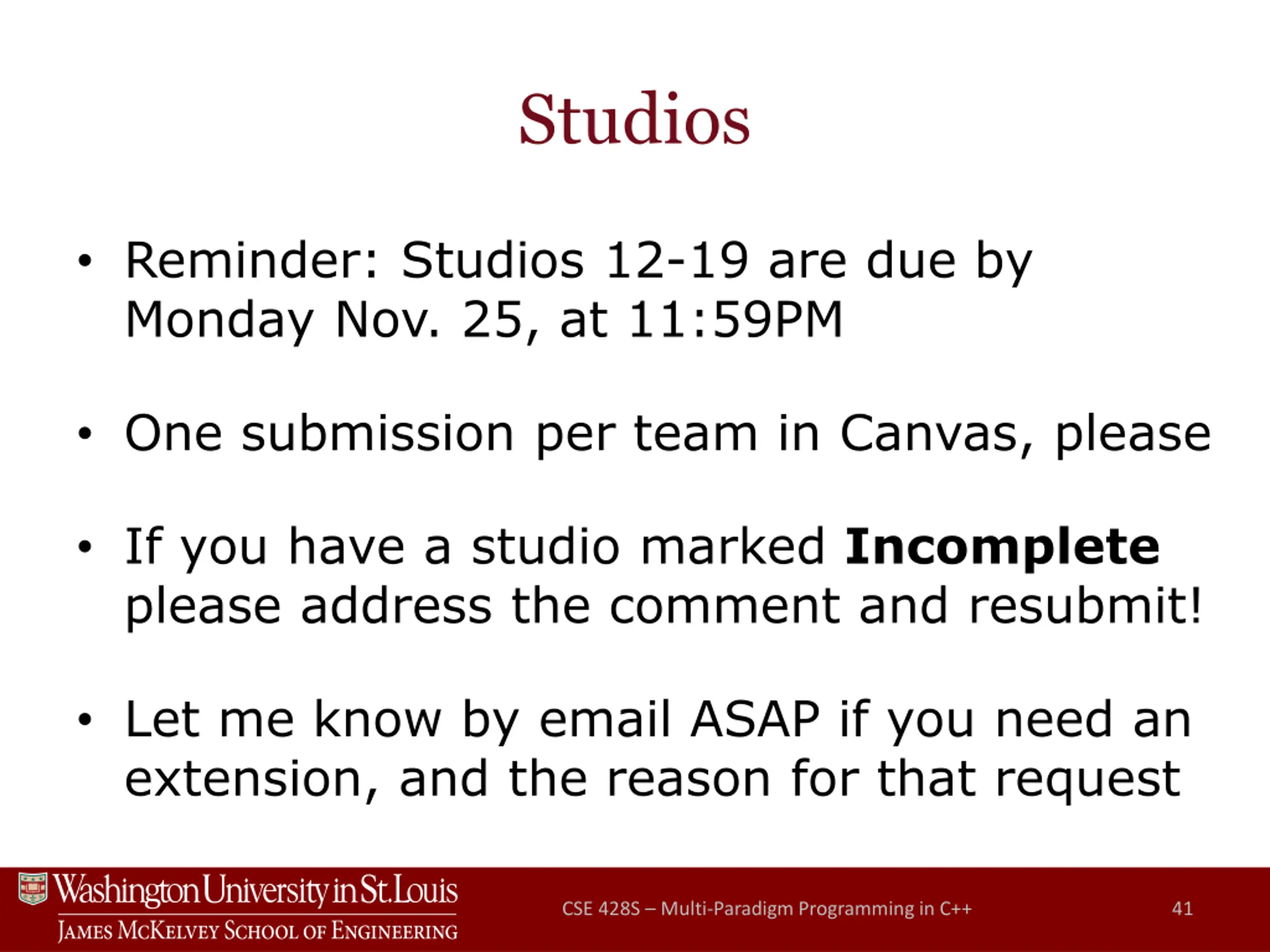 Studios Reminder: Studios 12-19 are due by Monday Nov. 25, at 11:59PM One submission per team in Canvas, please If you have a studio marked Incomplete please address the comment and resubmit! Let me know by email ASAP if you need an extension, and the reason for that request CSE 428S Multi-Paradigm Programming in C++ 41