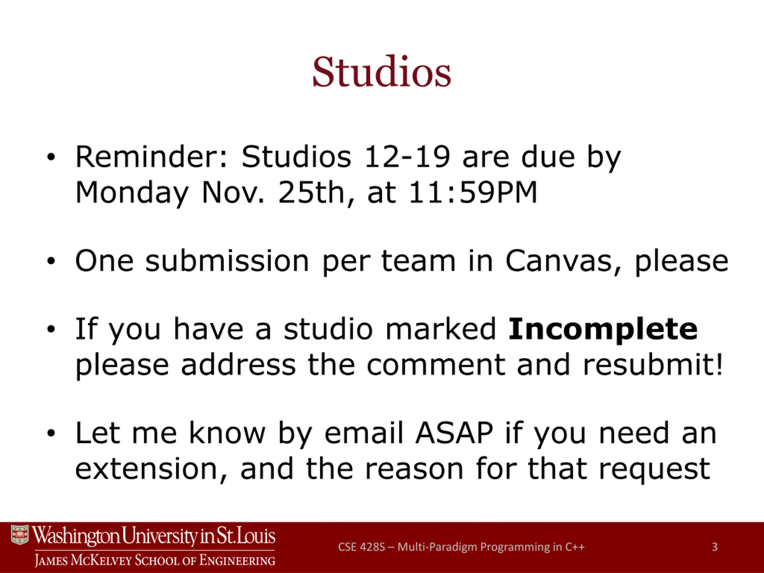 Studios Reminder: Studios 12-19 are due by Monday Nov. 25th, at 11:59PM One submission per team in Canvas, please If you have a studio marked Incomplete please address the comment and resubmit! Let me know by email ASAP if you need an extension, and the reason for that request CSE 428S Multi-Paradigm Programming in C++ 3