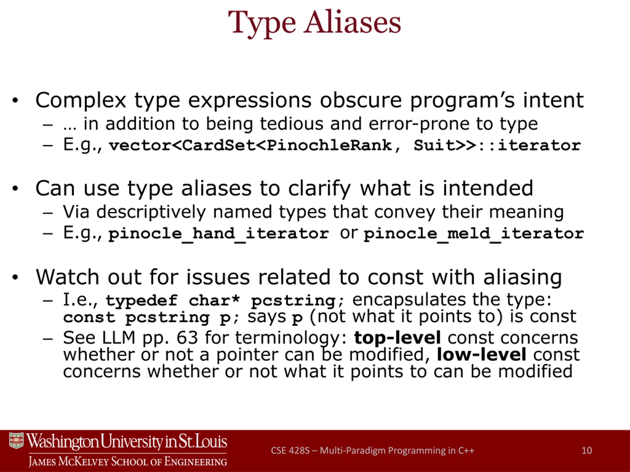 Type Aliases Complex type expressions obscure program s intent in addition to being tedious and error-prone to type E.g., vector<CardSet<PinochleRank, Suit>>::iterator Can use type aliases to clarify what is intended Via descriptively named types that convey their meaning E.g., pinocle_hand_iterator or pinocle_meld_iterator Watch out for issues related to const with aliasing I.e., typedef char* pcstring; encapsulates the type: const pcstring p; says p (not what it points to) is const See LLM pp. 63 for terminology: top-level const concerns whether or not a pointer can be modified, low-level const concerns whether or not what it points to can be modified CSE 428S Multi-Paradigm Programming in C++ 10