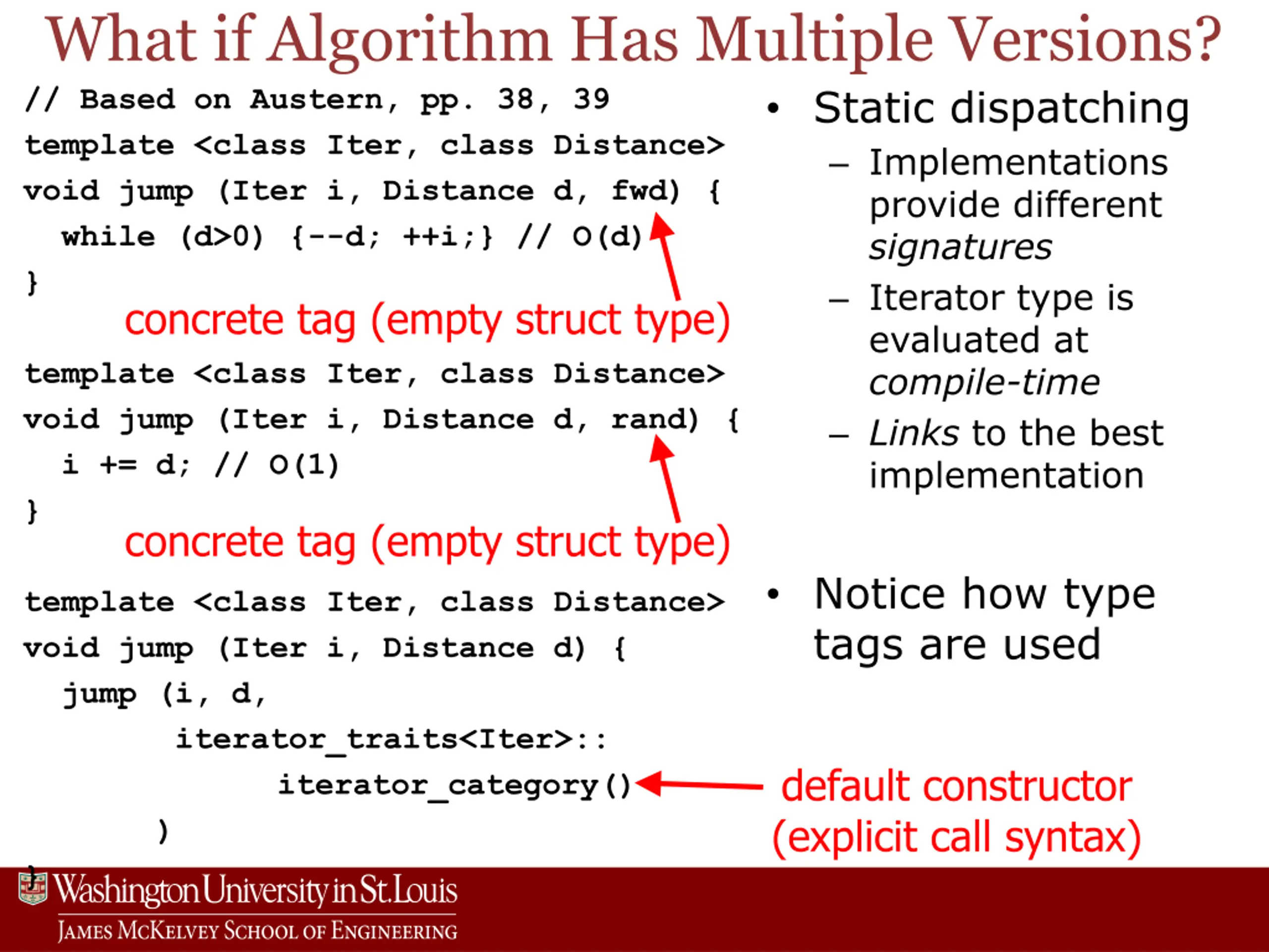 What if Algorithm Has Multiple Versions? // Based on Austern, pp. 38, 39 template <class Iter, class Distance> void jump (Iter i, Distance d, fwd) { while (d>0) {--d; ++i;} // O(d) } concrete tag (empty struct type) Static dispatching Implementations provide different signatures Iterator type is evaluated at compile-time Links to the best implementation template <class Iter, class Distance> void jump (Iter i, Distance d, rand) { i += d; // O(1) } concrete tag (empty struct type) Notice how type tags are used template <class Iter, class Distance> void jump (Iter i, Distance d) { jump (i, d, iterator_traits<Iter>:: iterator_category() ) } default constructor (explicit call syntax)