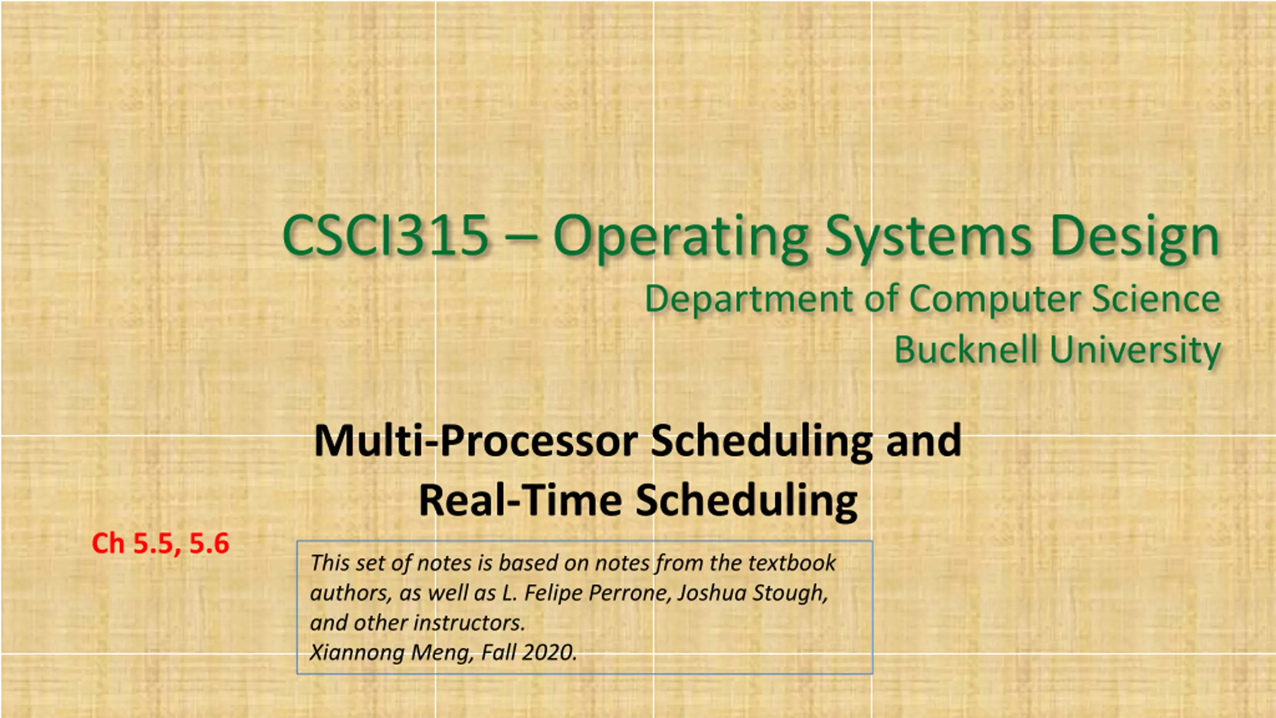 CSCI315 Operating Systems Design Department of Computer Science Bucknell University Multi-Processor Scheduling and Real-Time Scheduling Ch 5.5, 5.6 This set of notes is based on notes from the textbook authors, as well as L. Felipe Perrone, Joshua Stough, and other instructors. Xiannong Meng, Fall 2020.