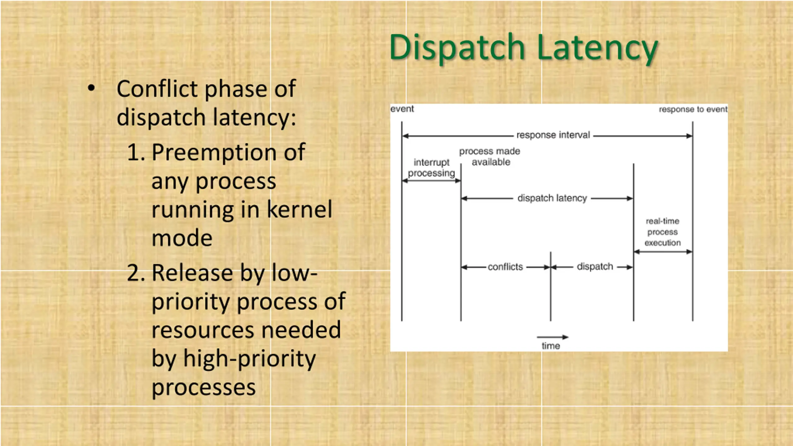 Dispatch Latency Conflict phase of dispatch latency: 1.Preemption of any process running in kernel mode 2.Release by low- priority process of resources needed by high-priority processes