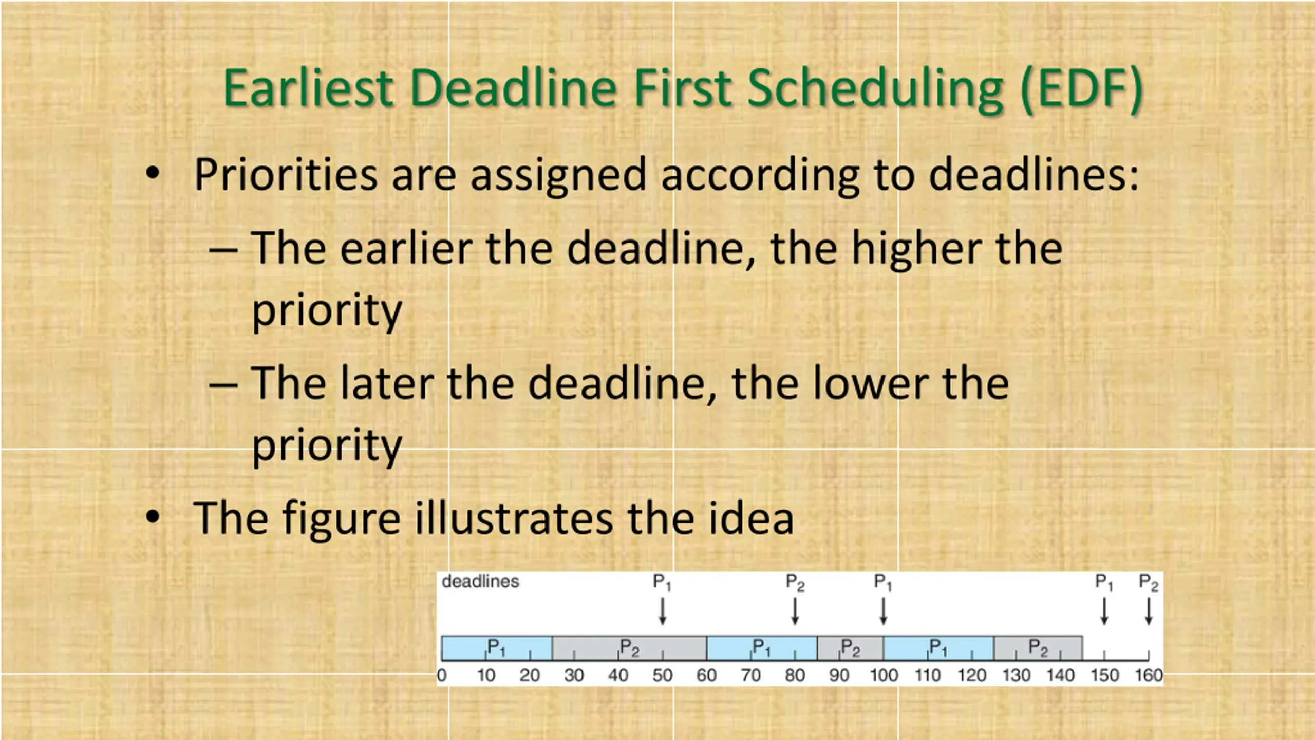 Earliest Deadline First Scheduling (EDF) Priorities are assigned according to deadlines: The earlier the deadline, the higher the priority The later the deadline, the lower the priority The figure illustrates the idea