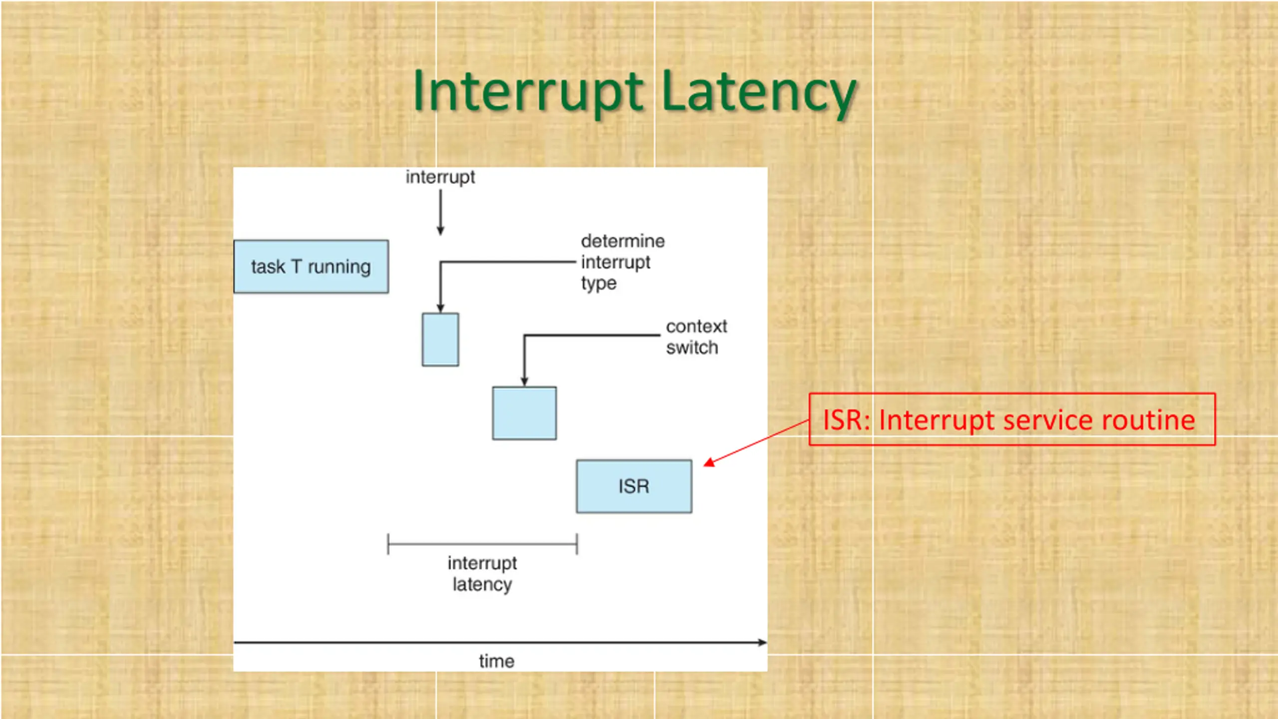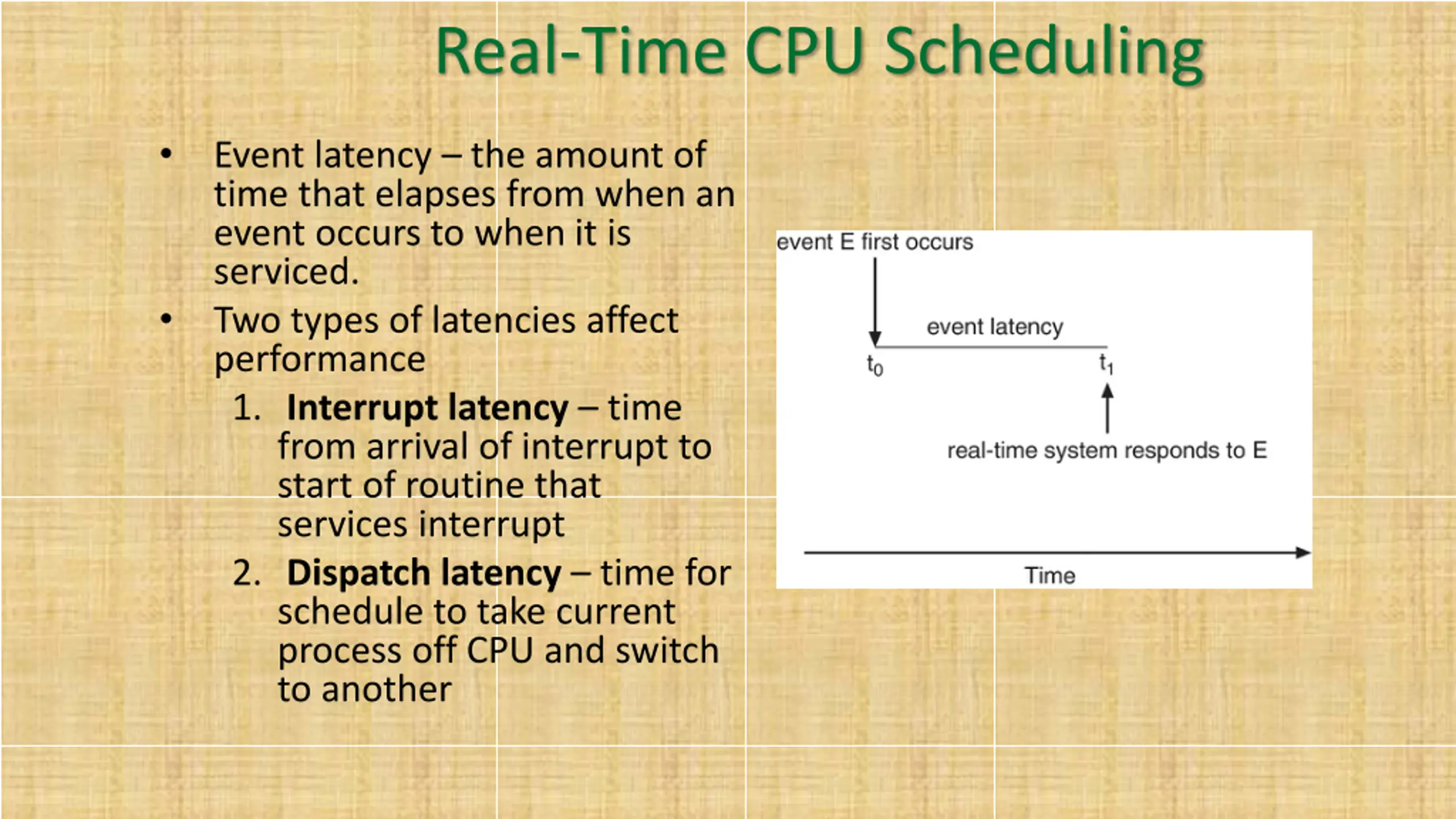 Real-Time CPU Scheduling Event latency the amount of time that elapses from when an event occurs to when it is serviced. Two types of latencies affect performance 1. Interrupt latency time from arrival of interrupt to start of routine that services interrupt 2. Dispatch latency time for schedule to take current process off CPU and switch to another