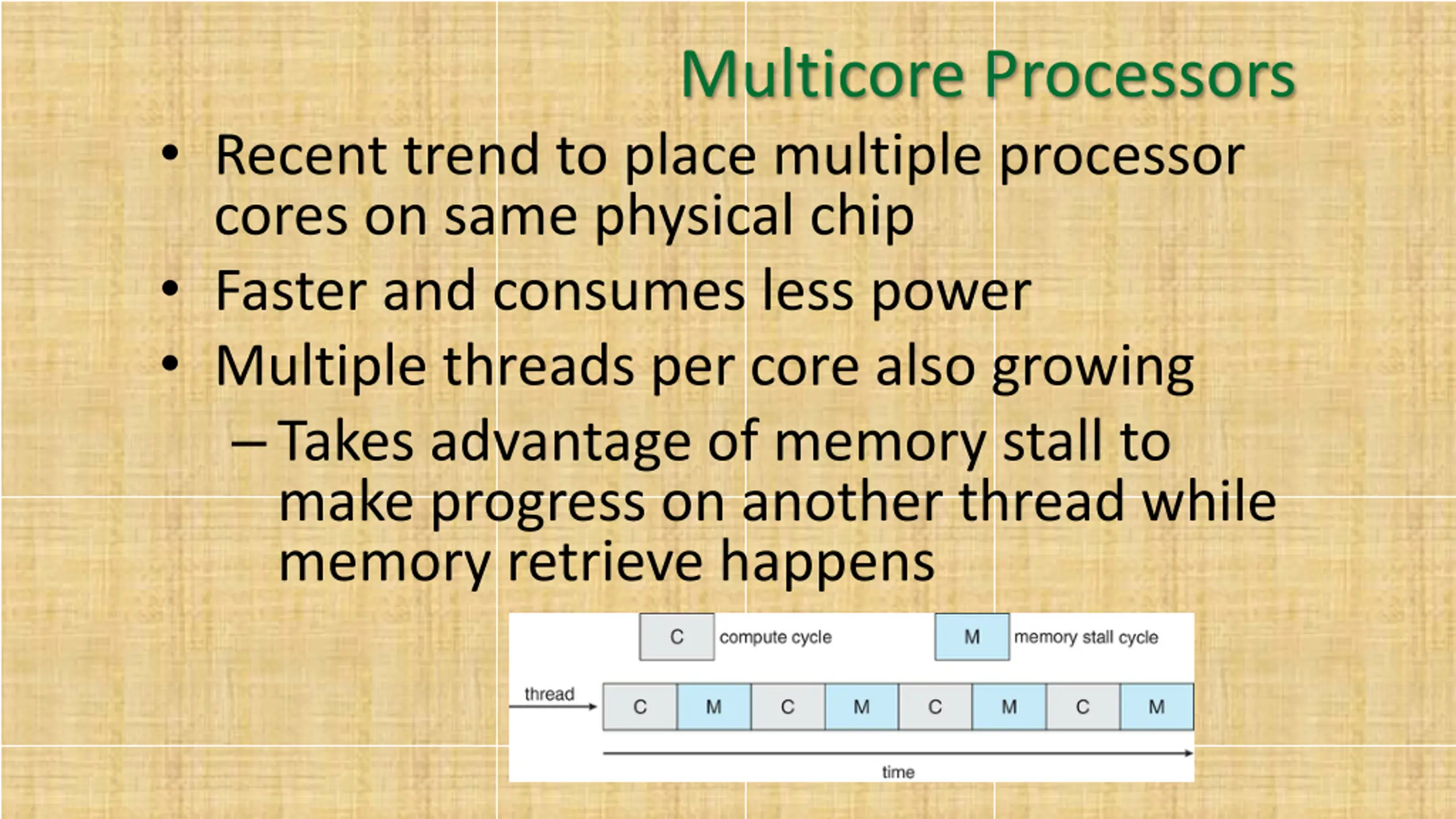 Multicore Processors Recent trend to place multiple processor cores on same physical chip Faster and consumes less power Multiple threads per core also growing Takes advantage of memory stall to make progress on another thread while memory retrieve happens