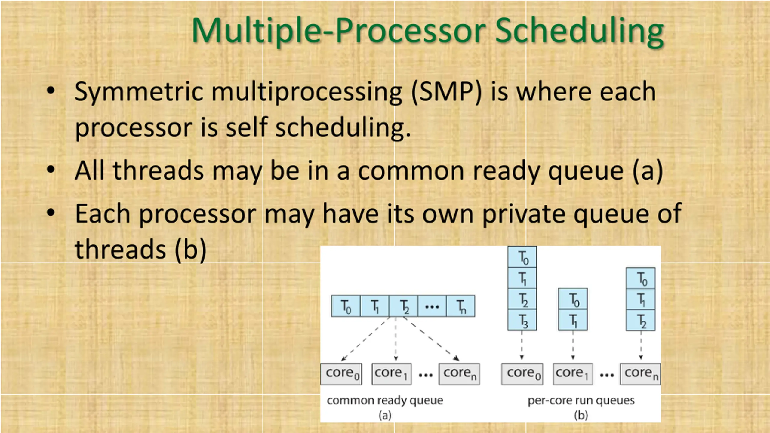 Multiple-Processor Scheduling Symmetric multiprocessing (SMP) is where each processor is self scheduling. All threads may be in a common ready queue (a) Each processor may have its own private queue of threads (b)