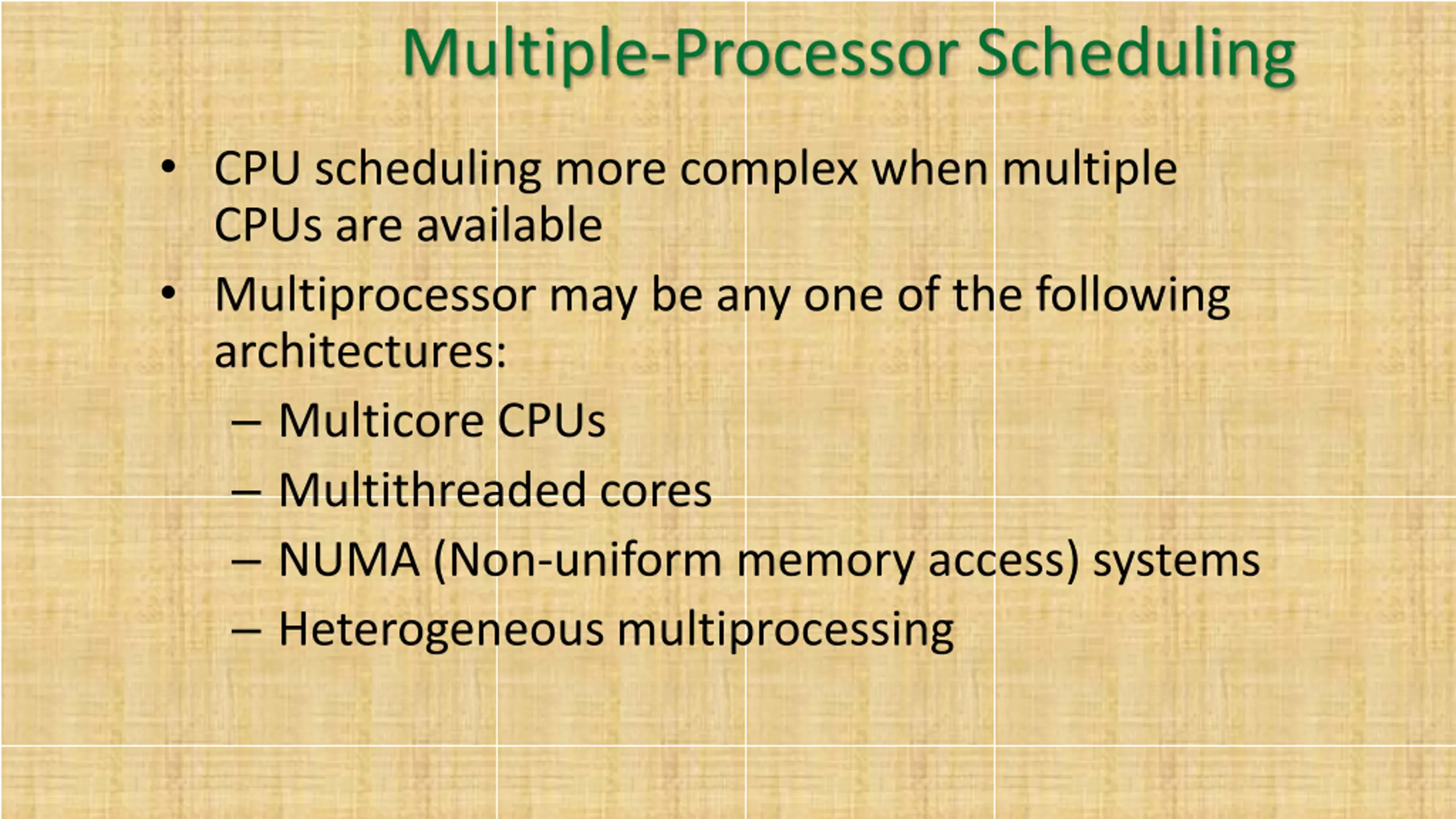Multiple-Processor Scheduling CPU scheduling more complex when multiple CPUs are available Multiprocessor may be any one of the following architectures: Multicore CPUs Multithreaded cores NUMA (Non-uniform memory access) systems Heterogeneous multiprocessing