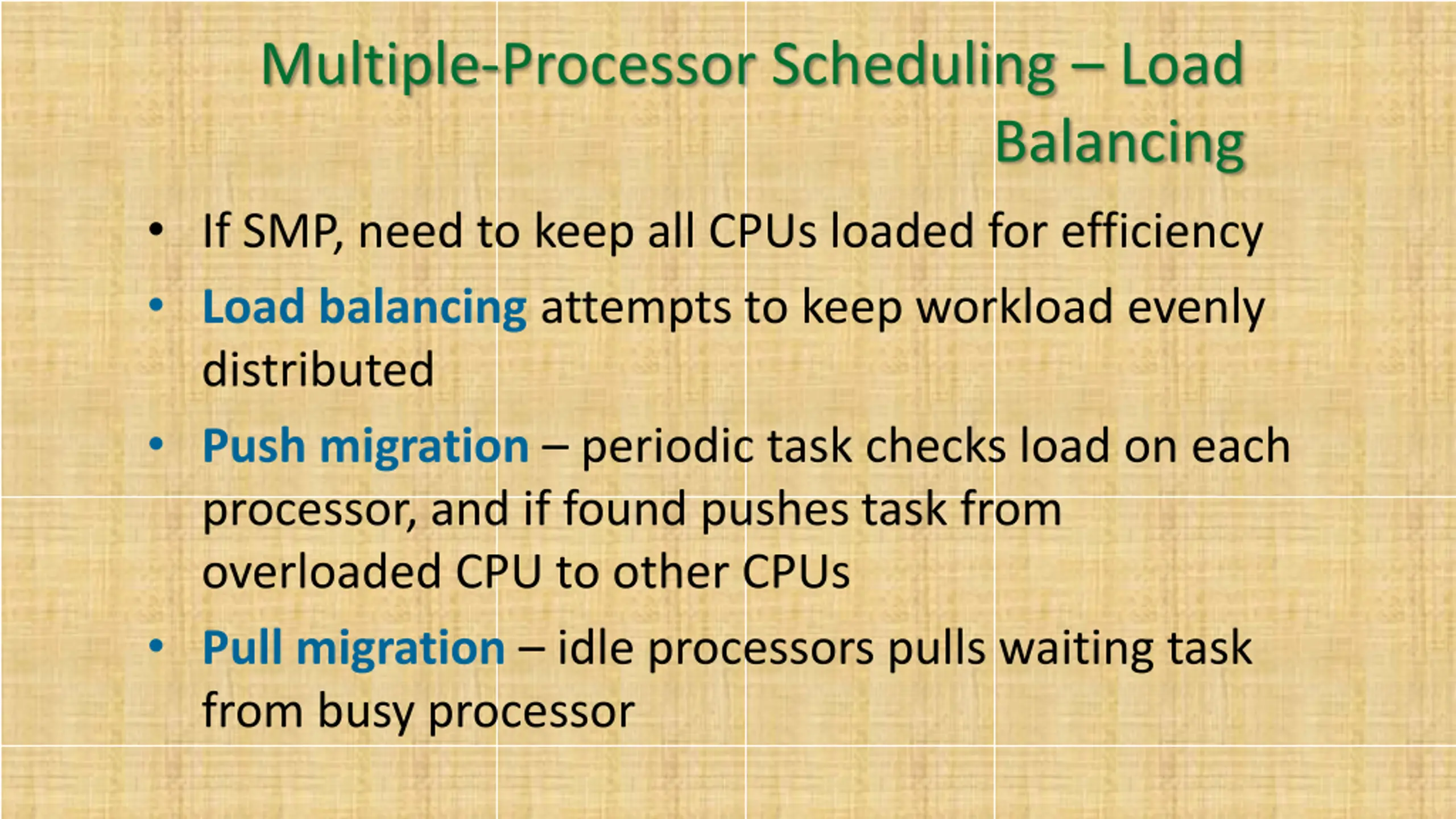 Multiple-Processor Scheduling Load Balancing If SMP, need to keep all CPUs loaded for efficiency Load balancing attempts to keep workload evenly distributed Push migration periodic task checks load on each processor, and if found pushes task from overloaded CPU to other CPUs Pull migration idle processors pulls waiting task from busy processor