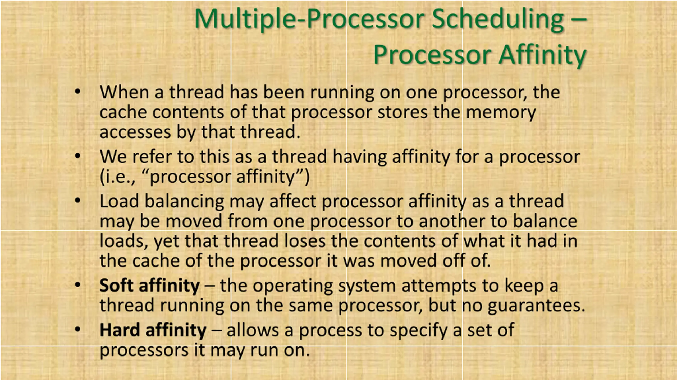 Multiple-Processor Scheduling Processor Affinity When a thread has been running on one processor, the cache contents of that processor stores the memory accesses by that thread. We refer to this as a thread having affinity for a processor (i.e., processor affinity ) Load balancing may affect processor affinity as a thread may be moved from one processor to another to balance loads, yet that thread loses the contents of what it had in the cache of the processor it was moved off of. Soft affinity the operating system attempts to keep a thread running on the same processor, but no guarantees. Hard affinity allows a process to specify a set of processors it may run on.