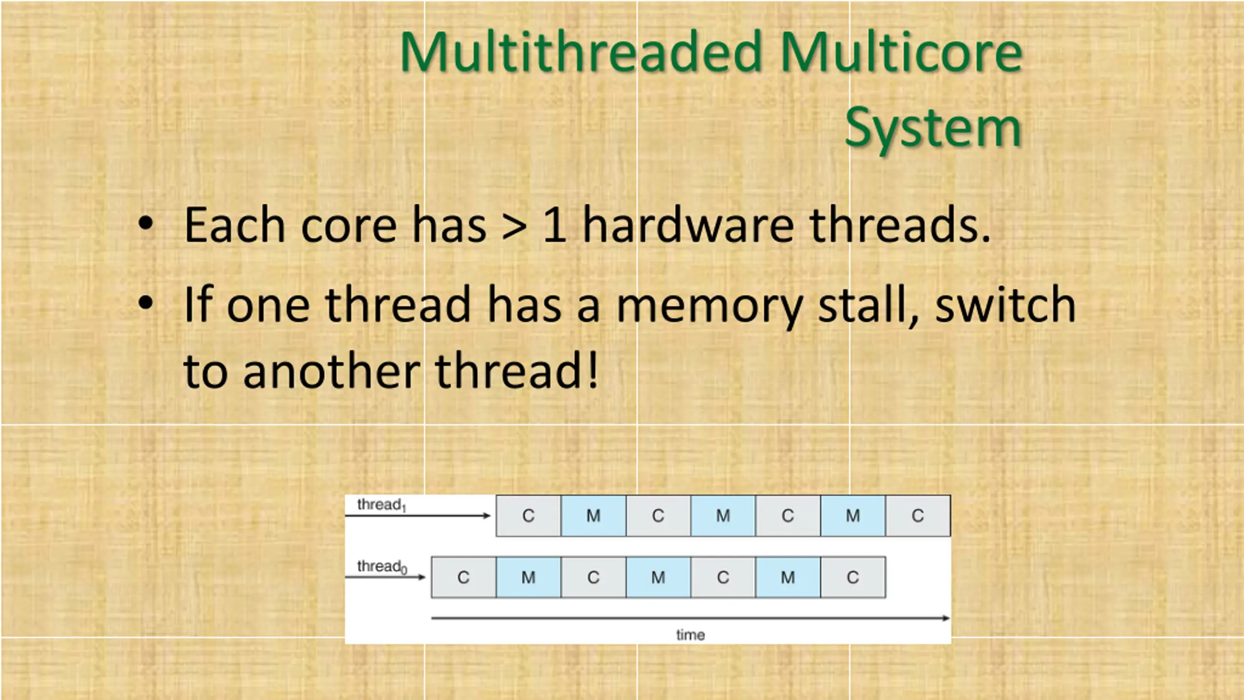 Multithreaded Multicore System Each core has > 1 hardware threads. If one thread has a memory stall, switch to another thread!