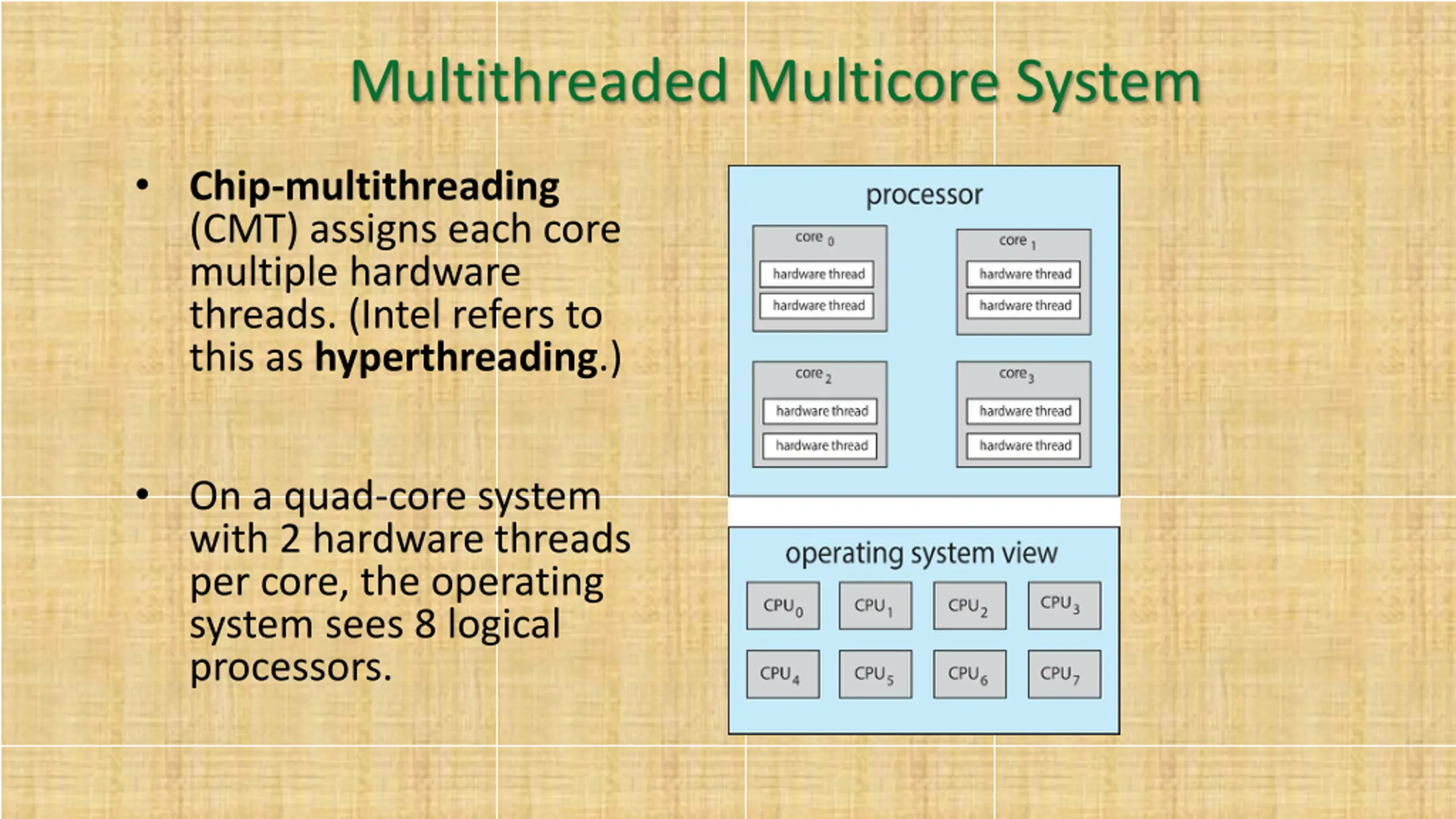 Multithreaded Multicore System Chip-multithreading (CMT) assigns each core multiple hardware threads. (Intel refers to this as hyperthreading.) On a quad-core system with 2 hardware threads per core, the operating system sees 8 logical processors.