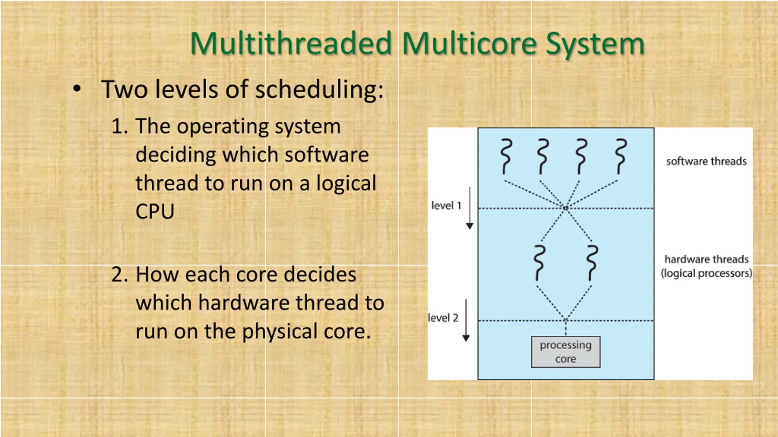 Multithreaded Multicore System Two levels of scheduling: 1. The operating system deciding which software thread to run on a logical CPU 2. How each core decides which hardware thread to run on the physical core.