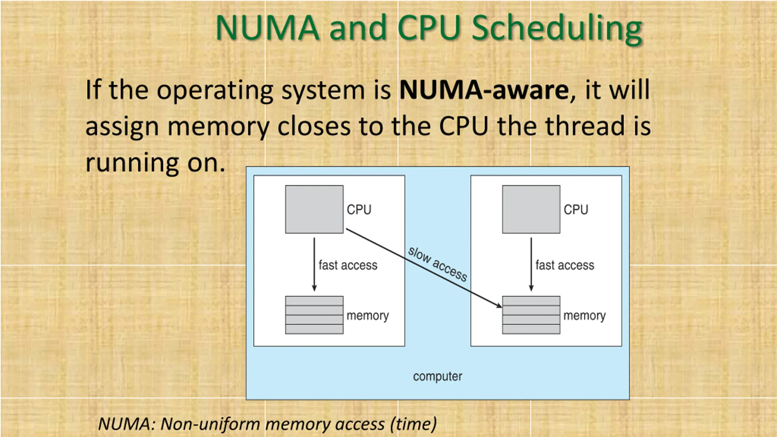NUMA and CPU Scheduling If the operating system is NUMA-aware, it will assign memory closes to the CPU the thread is running on. NUMA: Non-uniform memory access (time)