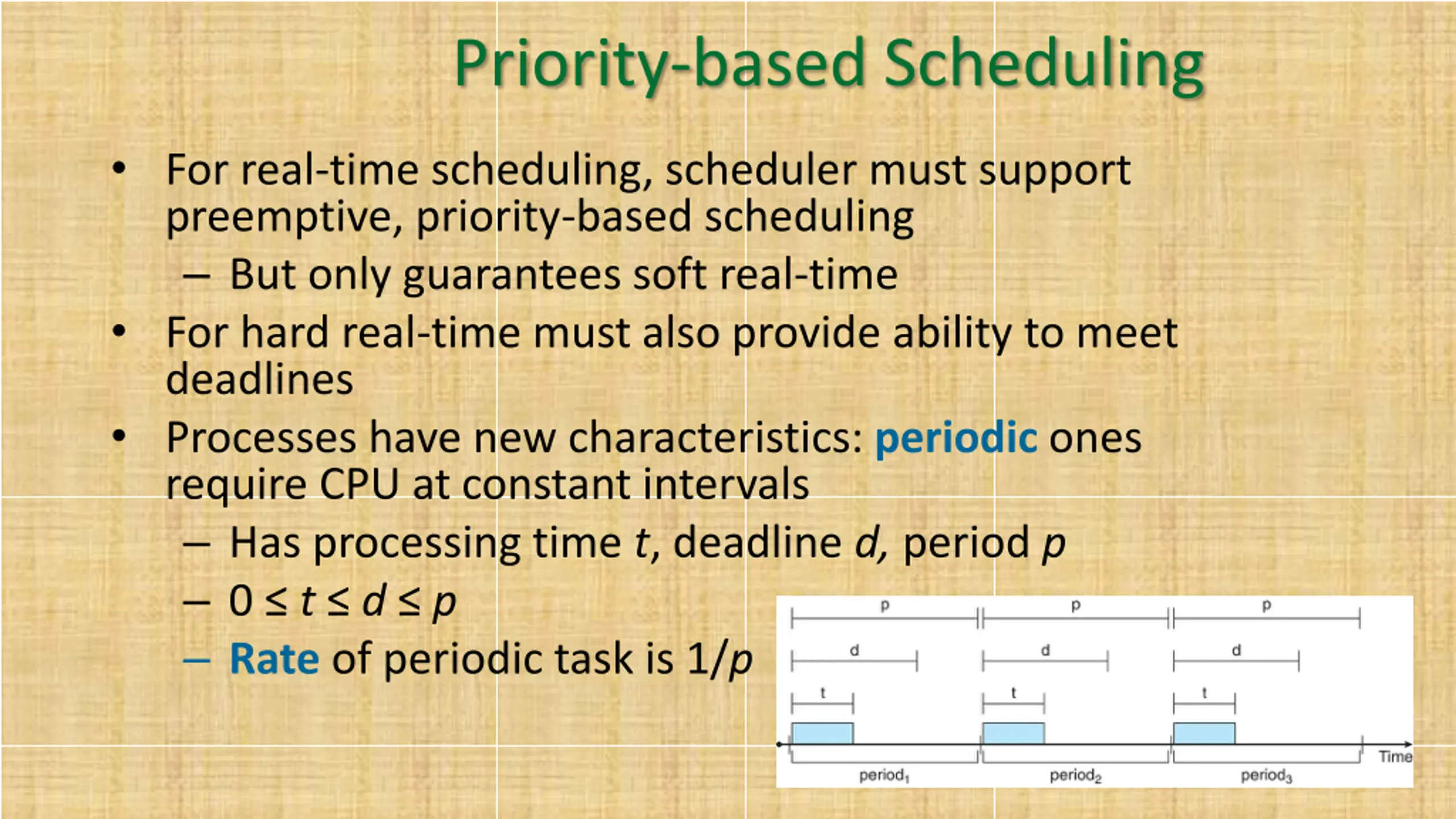 Priority-based Scheduling For real-time scheduling, scheduler must support preemptive, priority-based scheduling But only guarantees soft real-time For hard real-time must also provide ability to meet deadlines Processes have new characteristics: periodic ones require CPU at constant intervals Has processing time t, deadline d, period p 0 t d p Rate of periodic task is 1/p