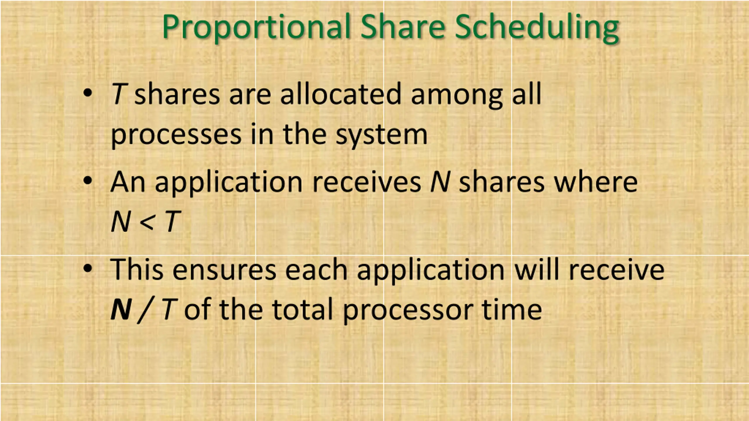 Proportional Share Scheduling T shares are allocated among all processes in the system An application receives N shares where N < T This ensures each application will receive N / T of the total processor time