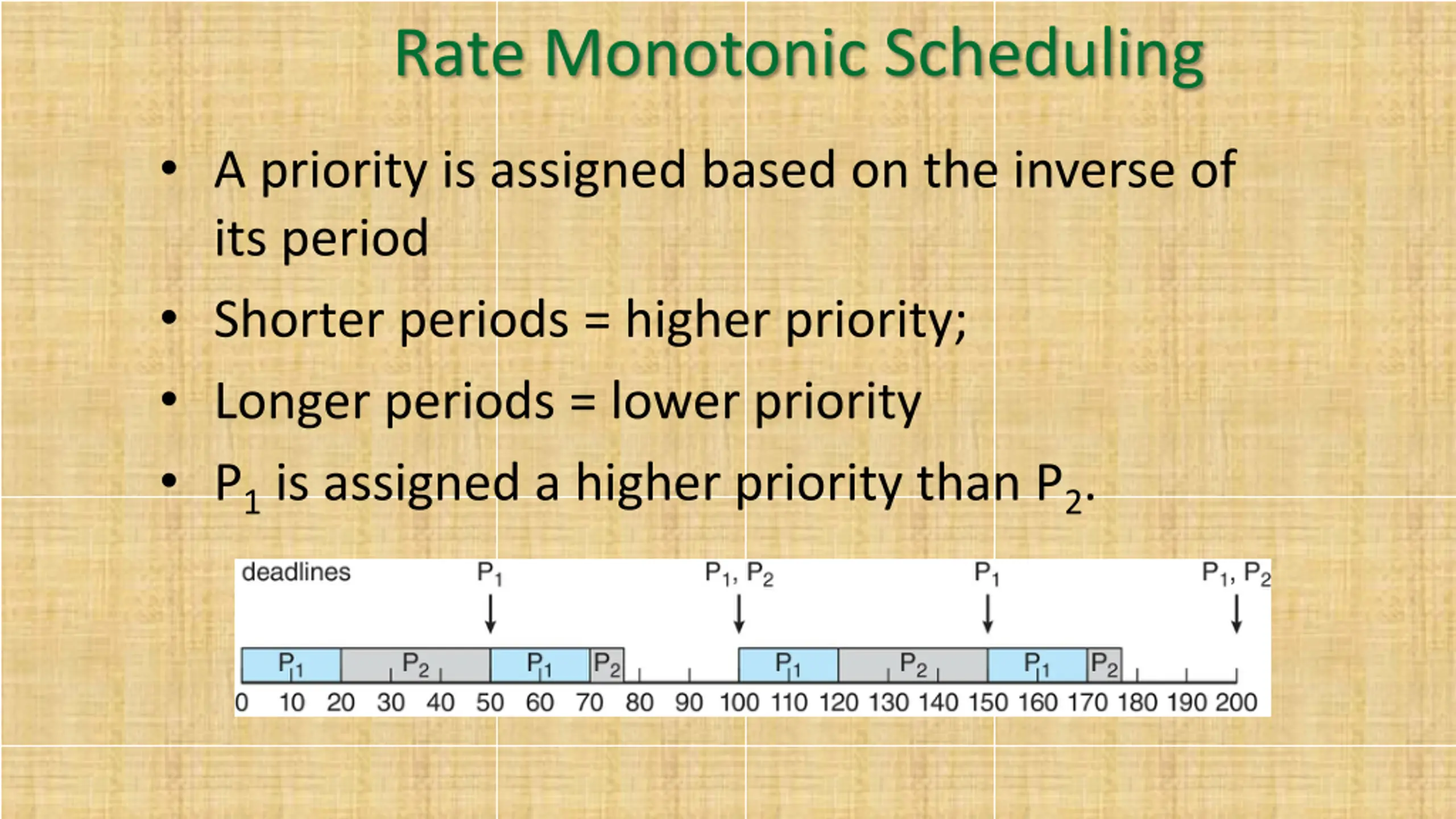 Rate Monotonic Scheduling A priority is assigned based on the inverse of its period Shorter periods = higher priority; Longer periods = lower priority P1 is assigned a higher priority than P2.