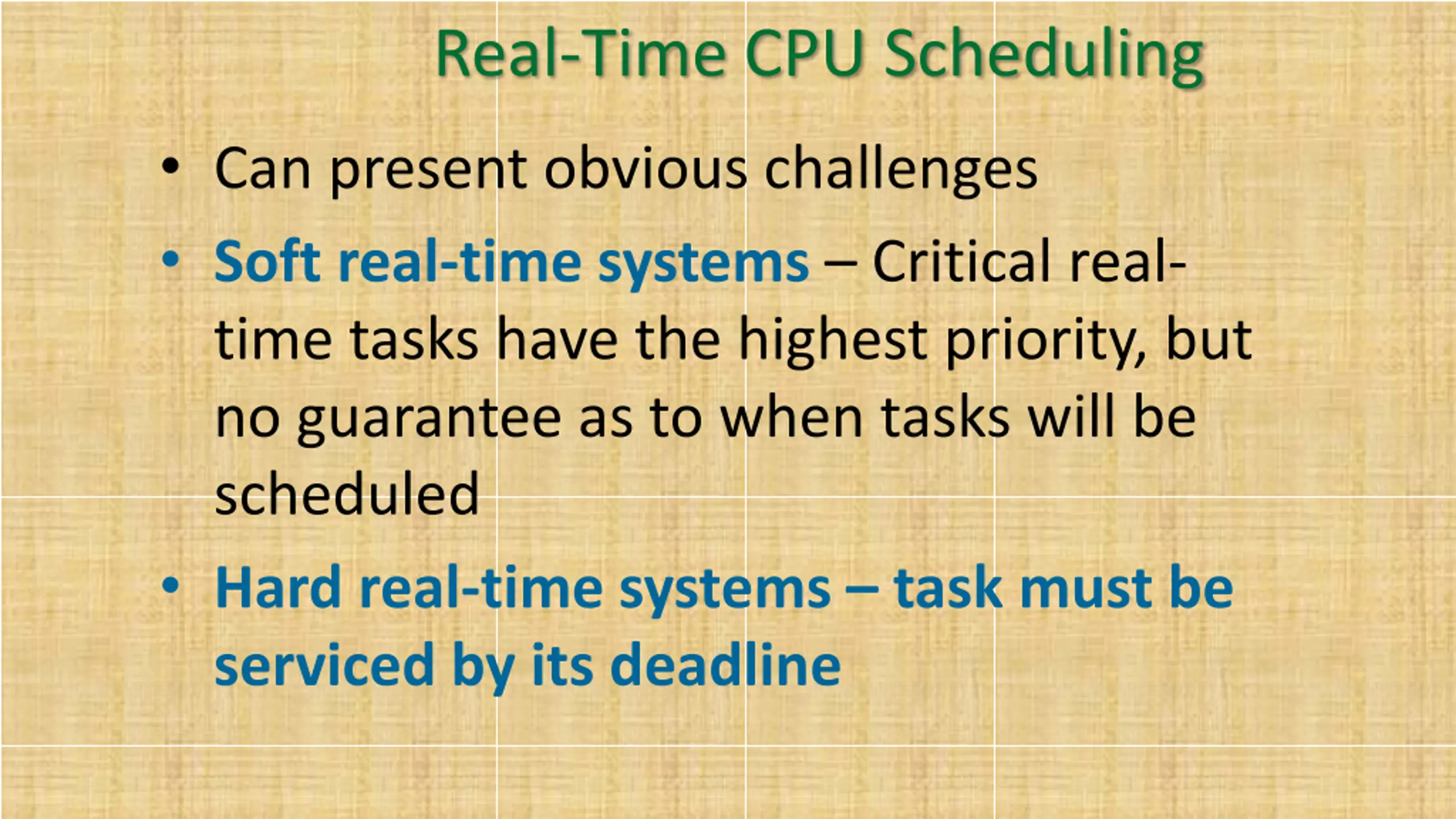 Real-Time CPU Scheduling Can present obvious challenges Soft real-time systems Critical real- time tasks have the highest priority, but no guarantee as to when tasks will be scheduled Hard real-time systems task must be serviced by its deadline