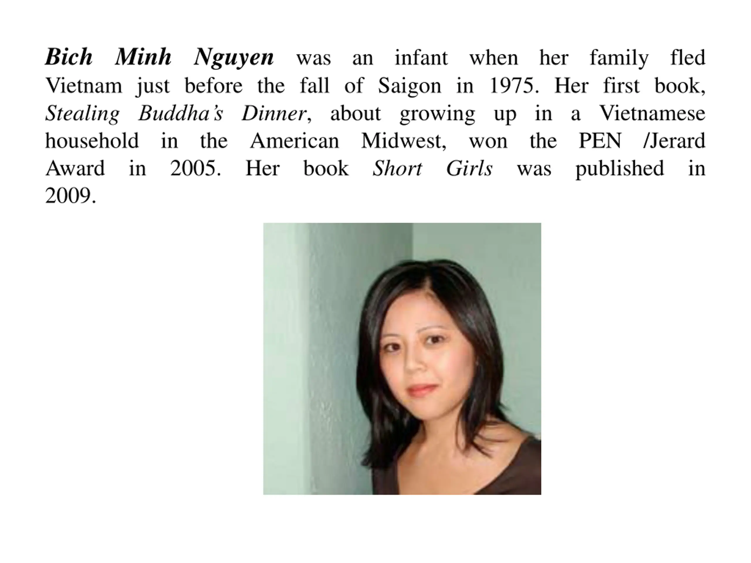 Bich Minh Nguyen Vietnam just before the fall of Saigon in 1975. Her first book, Stealing Buddha s Dinner, about growing up in a Vietnamese household in the American Midwest, Award in 2005. Her book Short 2009. was an infant when her family fled won the was PEN published /Jerard in Girls