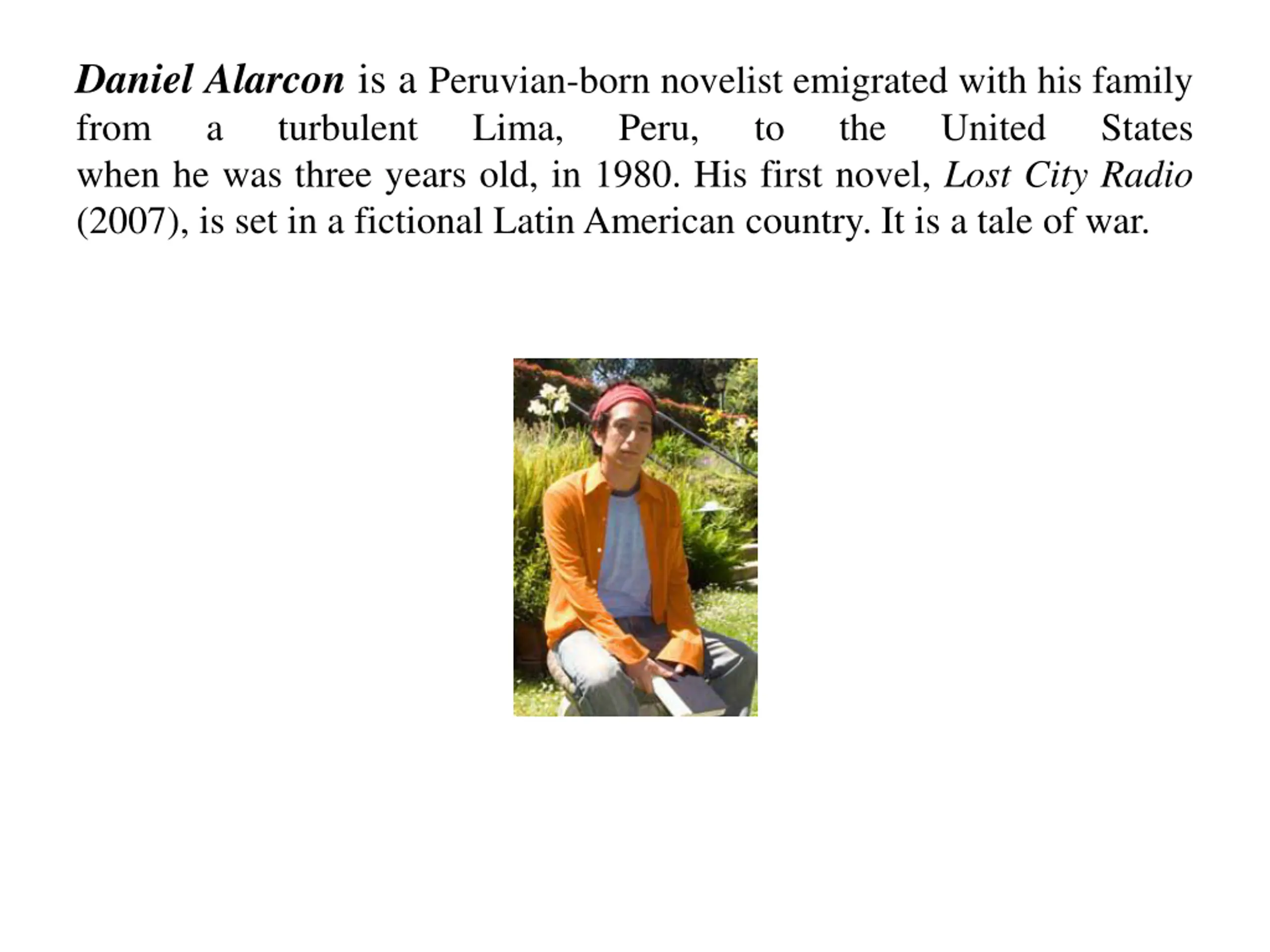 Daniel Alarcon is a Peruvian-born novelist emigrated with his family from a turbulent Lima, Peru, when he was three years old, in 1980. His first novel, Lost City Radio (2007), is set in a fictional Latin American country. It is a tale of war. to the United States