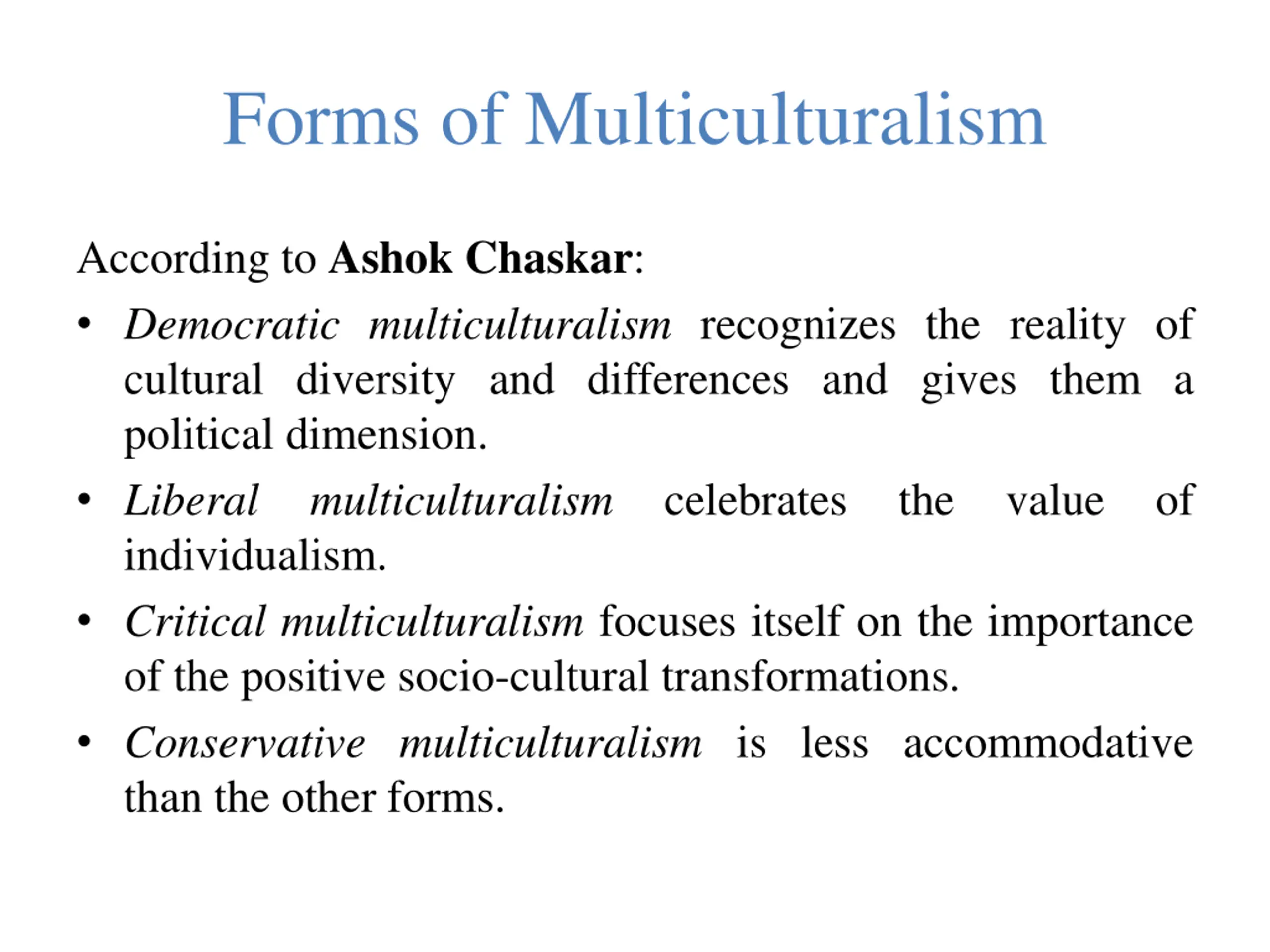 Forms of Multiculturalism According to Ashok Chaskar: Democratic multiculturalism recognizes the reality of cultural diversity and differences and gives them a political dimension. Liberal multiculturalism individualism. Critical multiculturalism focuses itself on the importance of the positive socio-cultural transformations. Conservative multiculturalism is less accommodative than the other forms. celebrates the value of