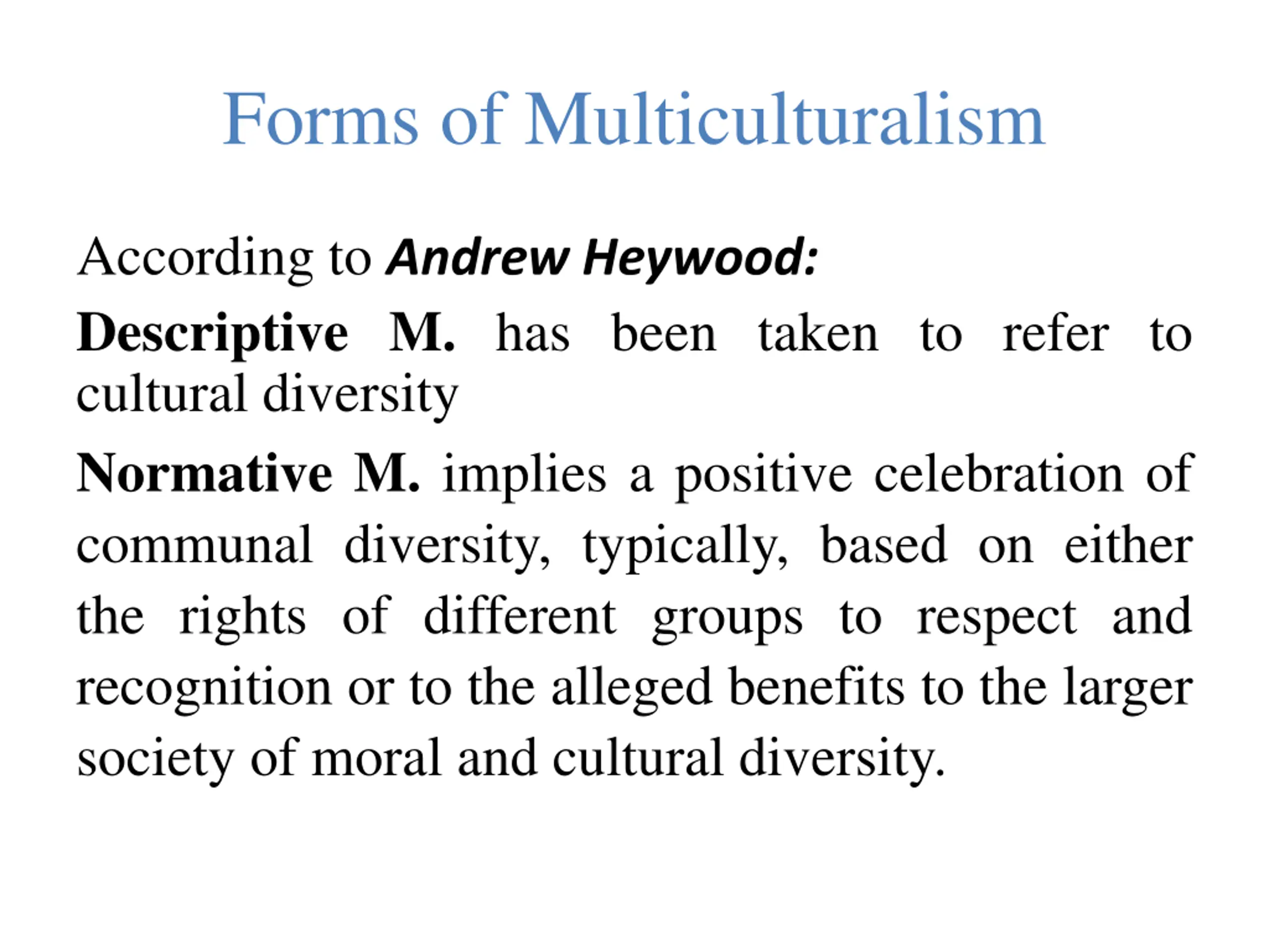 Forms of Multiculturalism According to Andrew Heywood: Descriptive M. has been taken to refer to cultural diversity Normative M. implies a positive celebration of communal diversity, typically, based on either the rights of different groups to respect and recognition or to the alleged benefits to the larger society of moral and cultural diversity.