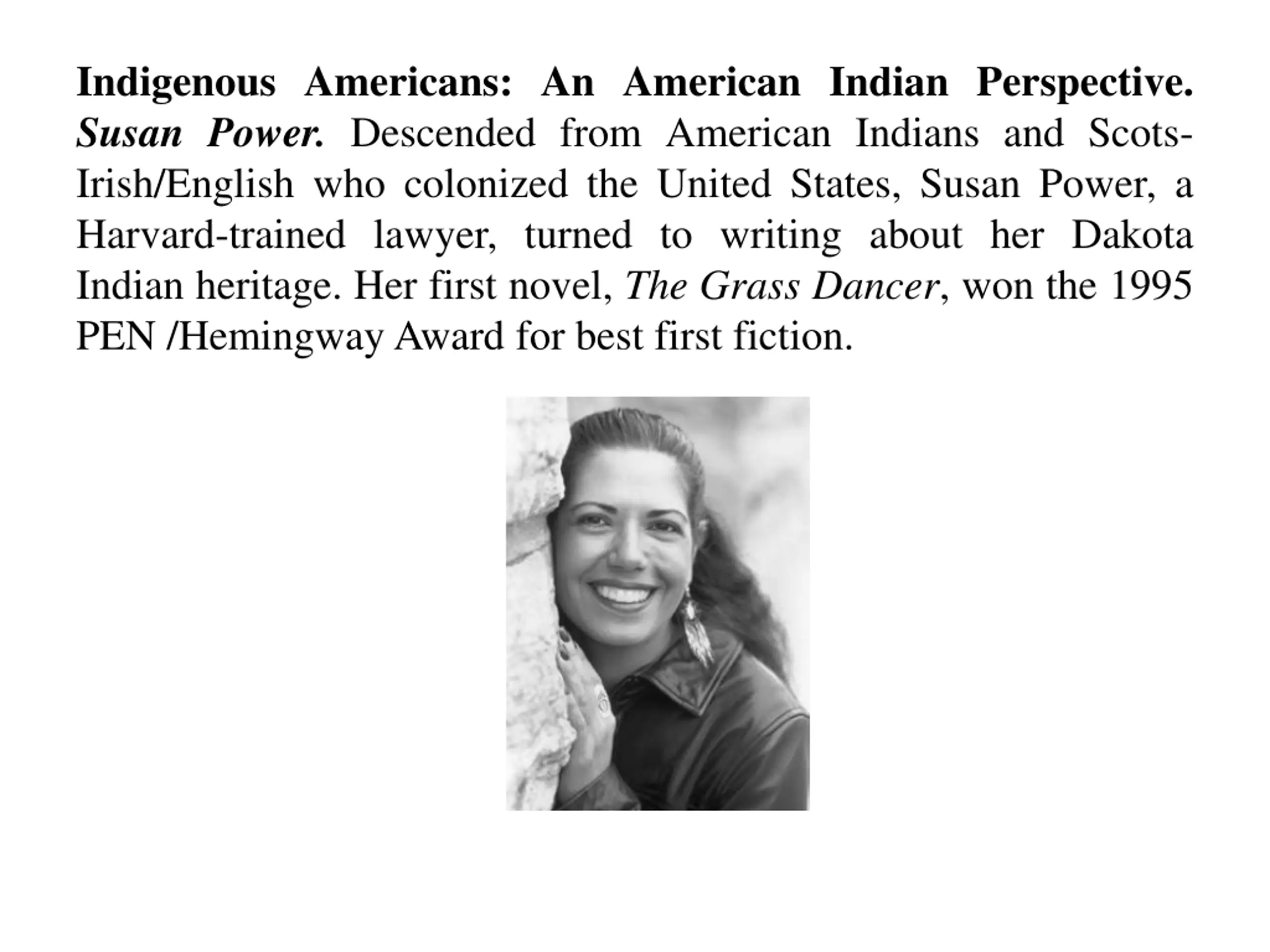 Indigenous Americans: An American Indian Perspective. Susan Power. Descended from American Indians and Scots- Irish/English who colonized the United States, Susan Power, a Harvard-trained lawyer, turned to writing about her Dakota Indian heritage. Her first novel, The Grass Dancer, won the 1995 PEN /HemingwayAward for best first fiction.