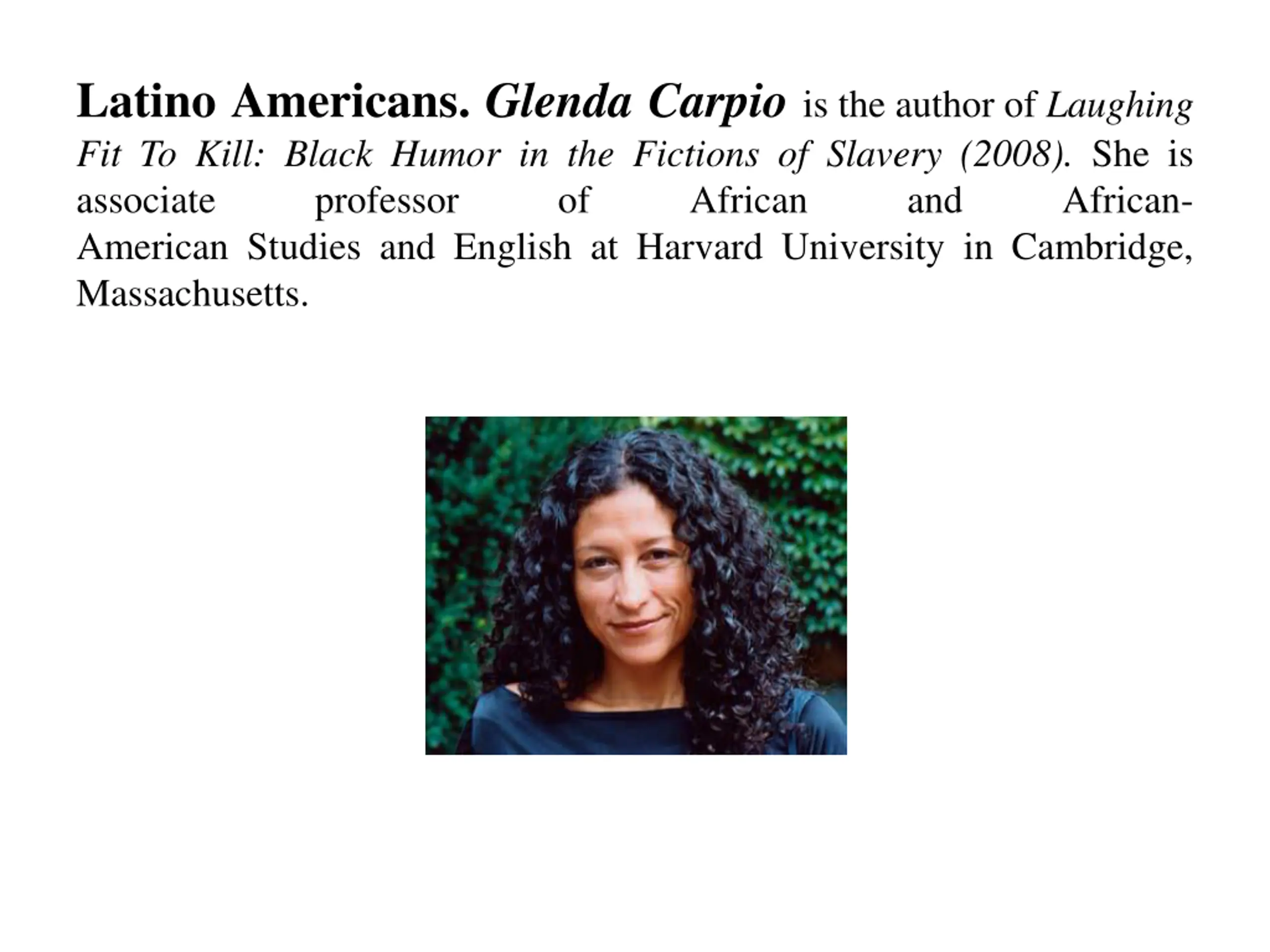 Latino Americans. Glenda Carpio is the author of Laughing Fit To Kill: Black Humor in the Fictions of Slavery (2008). She is associate professor of American Studies and English at Harvard University in Cambridge, Massachusetts. African and African-